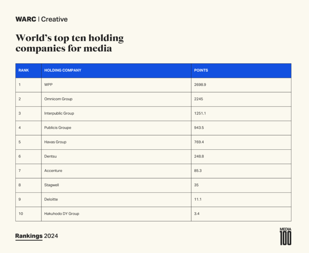 WPP has maintained its position at the top of the holding company ranking for seven consecutive years, with seven networks in the top 50, including three in the top five: Mindshare Worldwide ranked second, EssenceMediacom in third, and Wavemaker in fifth.