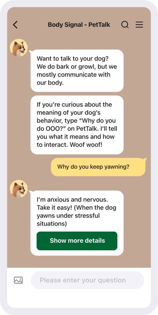 For example, if you ask “why do you keep yawning?” on PetTalk after seeing your dog yawn often, animated dog characters will appear on the screen to demonstrate the relevant body signal, and reply “I’m anxious and nervous right now.” Then, you would also be given advice to yawn back at your dog in order to convey a message of “as I see it, it is okay here” or “now take it easy.”