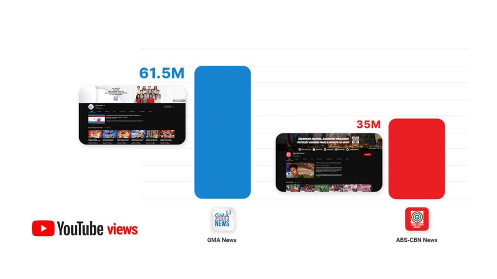 In terms of local news, GMA Integrated News on YouTube further widened its lead by logging in 61.5 million views – way ahead of ABS-CBN News’ 35 million. Even GMA Public Affairs‘ YouTube channel recorded higher views than the latter with 59.3 million.