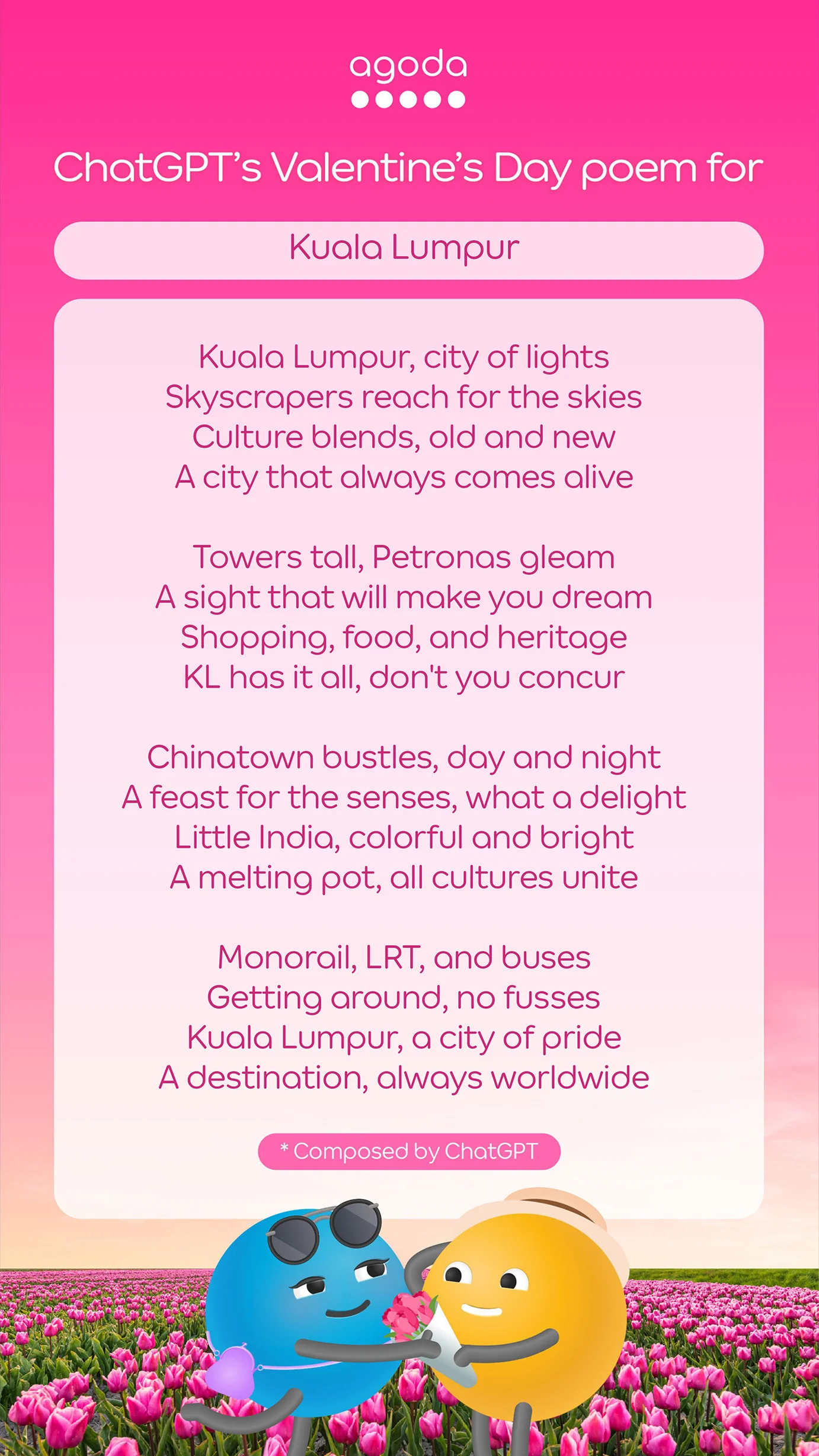 KUALA LUMPUR, MALAYSIA – Tokyo, Bangkok, and Singapore are this year’s most popular Valentine’s Day getaways in Asia, global digital travel platform Agoda revealed. The three Asian capitals are the most searched cities by couples celebrating on February 14 this year. To pay homage to these and other romantic hotspots in the top 14 searched destinations, Agoda commissioned AI-powered chatbot ChatGPT to compose unique poems inspired by these locations.