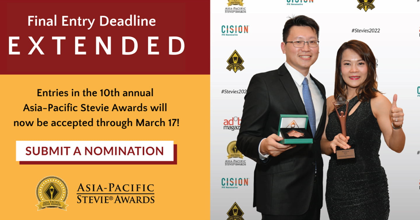By popular demand, the final entry deadline has been extended to March 17. The judging process will extend through March 26. The Gold, Silver, and Bronze Stevie Award winners will be announced on April 05. Winners will be celebrated during a virtual awards ceremony on June 27, instead of the traditional awards banquet that had been planned for May 27.