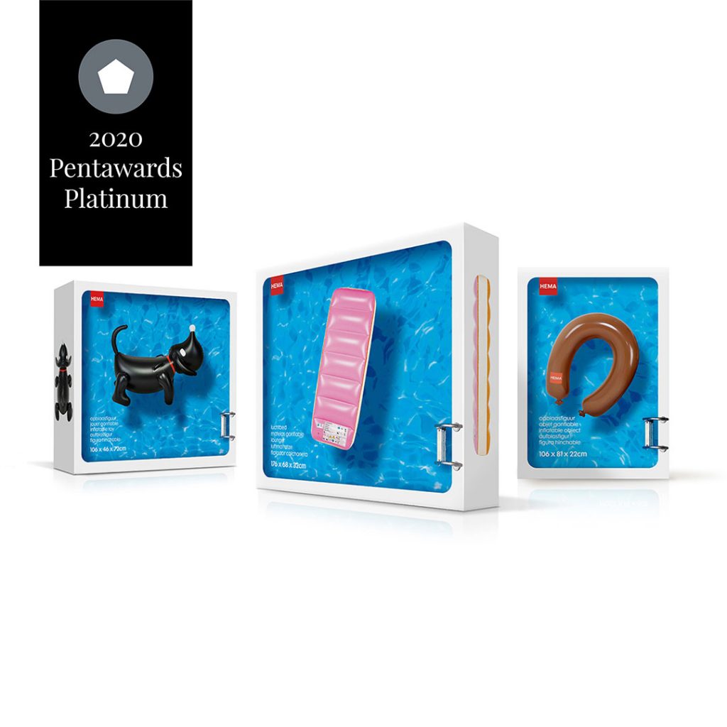 This charming range of packaging for Dutch retailer HEMA contains summer water inflatables. The design concept is to show a range of summer products that look like they have been dropped into mini swimming pools, and there’s even a steel step that leads into the pool on the front, bringing the image to life. All toys have been designed exclusively by HEMA and represent the retailers most famous icons like HEMA’s smoked sausage, Takkie the Dog, tompouce pastry and summer ice creams. HEMA’s overall ambition is to stop putting plastic products into plastic packaging, so carton boxes were being chosen to package and protect the products inside.