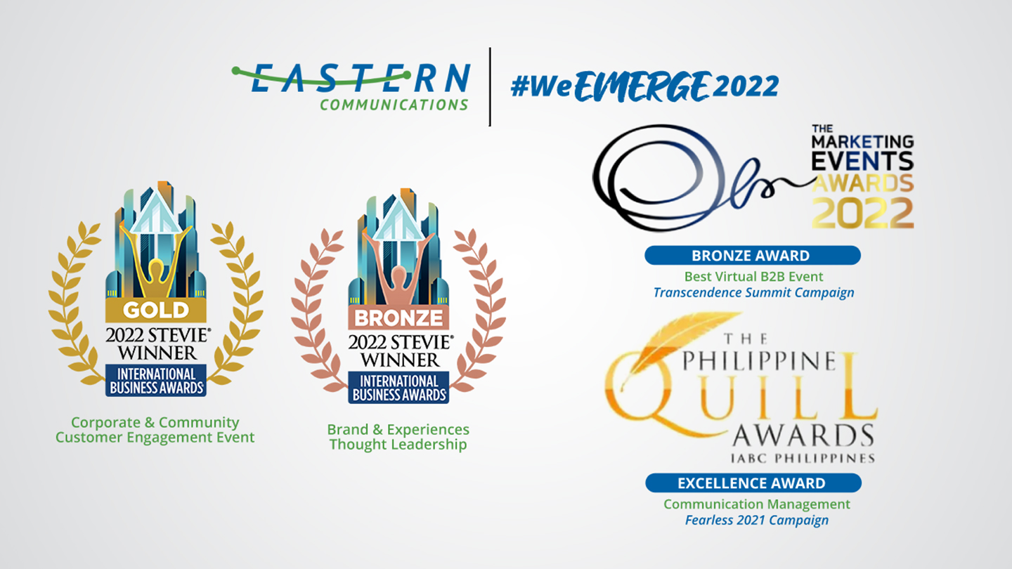 Eastern Communications’ initiatives were recognized in international awards, having bagged two Stevie awards at the 2022 International Business Awards. The company took home the gold for “Championing High Touch – Eastern Communications’ Blink, Our Strongest Stand Customer Engagement Events” under the Customer Engagement Category. Meanwhile, its campaign entitled “Eastern Communications’ E-Huddle 2021: Championing Digital Transformation with Industry Leaders” won the bronze award for Brand and Experiences – Thought Leadership Category.