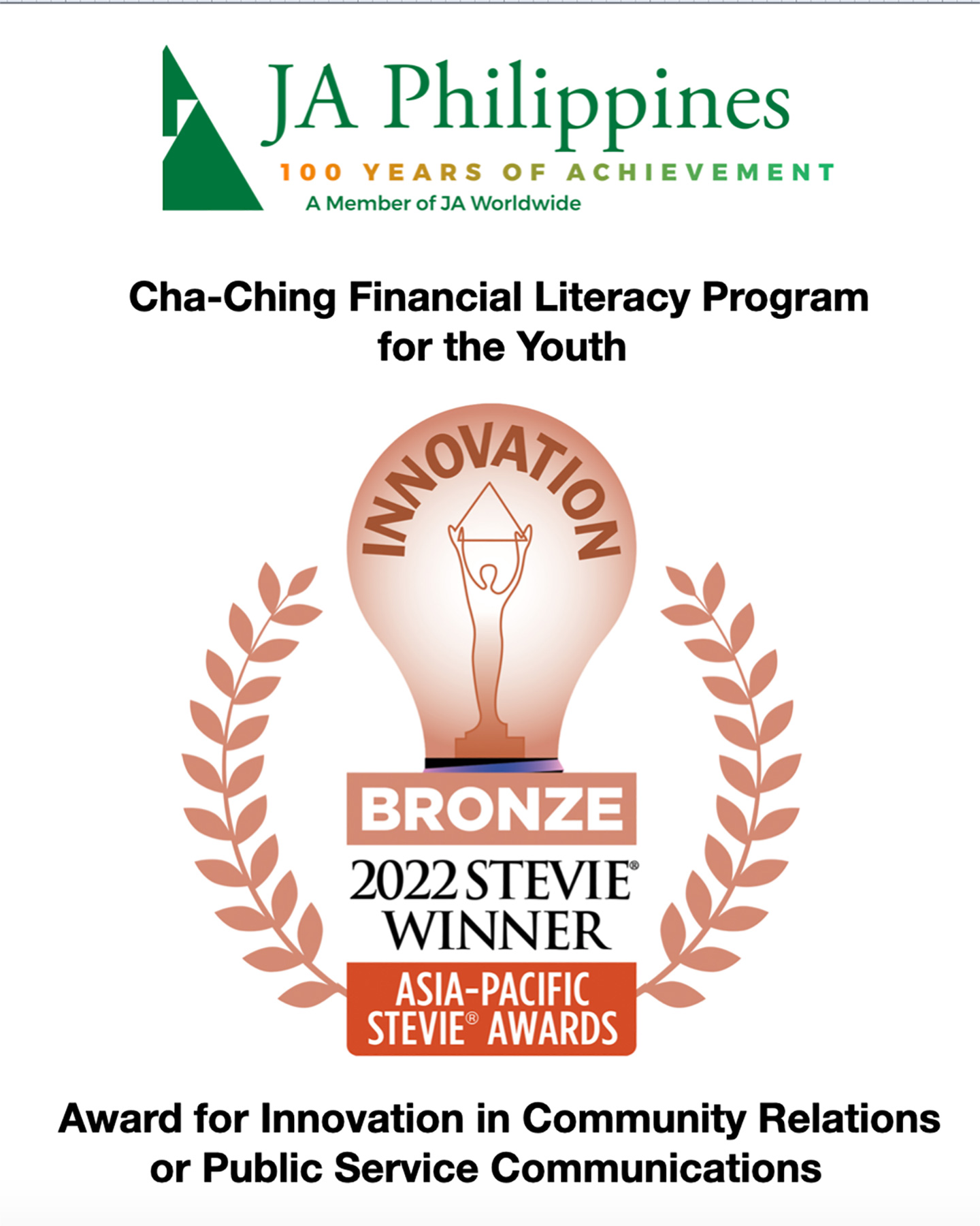 MANILA, PHILIPPINES – The Junior Achievement (JA) of the Philippines was named the winner of a Bronze Stevie Award for Innovation in Community Relations/Public Service Communications category in the ninth annual Asia-Pacific Stevie Awards.