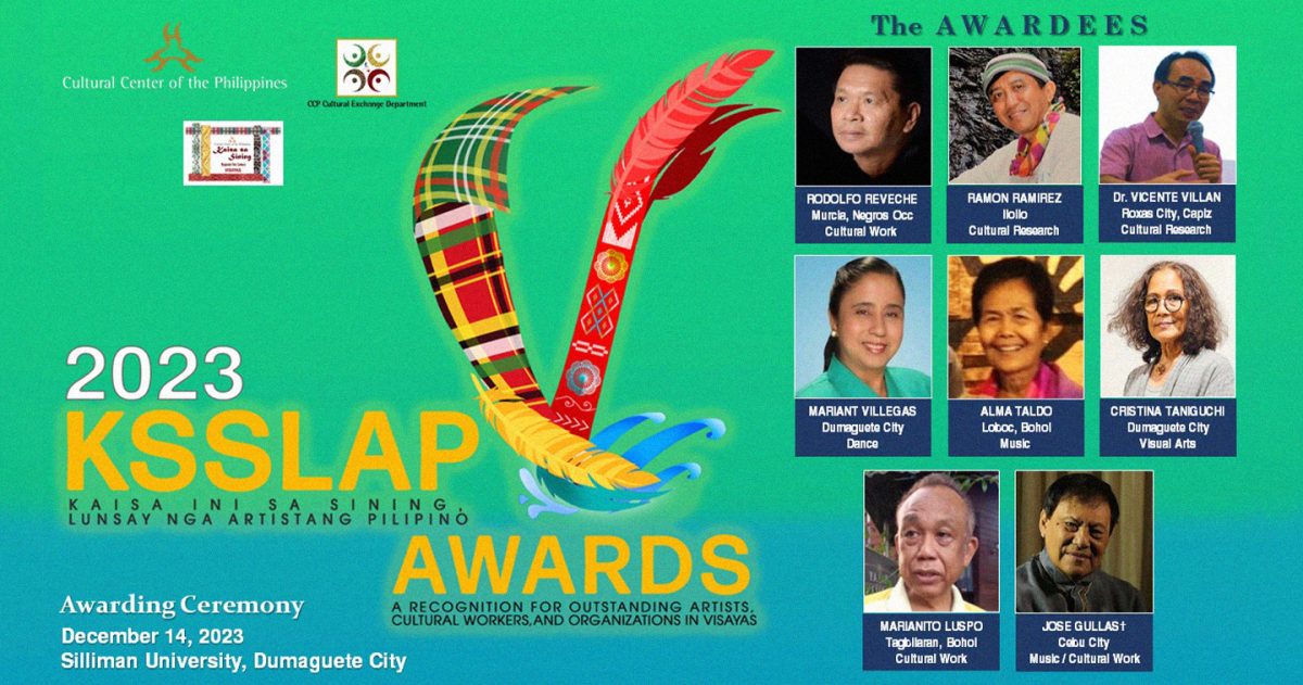 MANILA, PHILIPPINES — The Cultural Center of the Philippines (CCP) Kaisa Sa Sining (KSS) Visayas Network has announced the recipients of the second KSSLAP (Kaisa Ini sa Sining, Lunsay nga Artistang Pilipino) Awards. The awarding ceremony will be on December 14, at the Luce Auditorium at Silliman University, Dumaguete City.