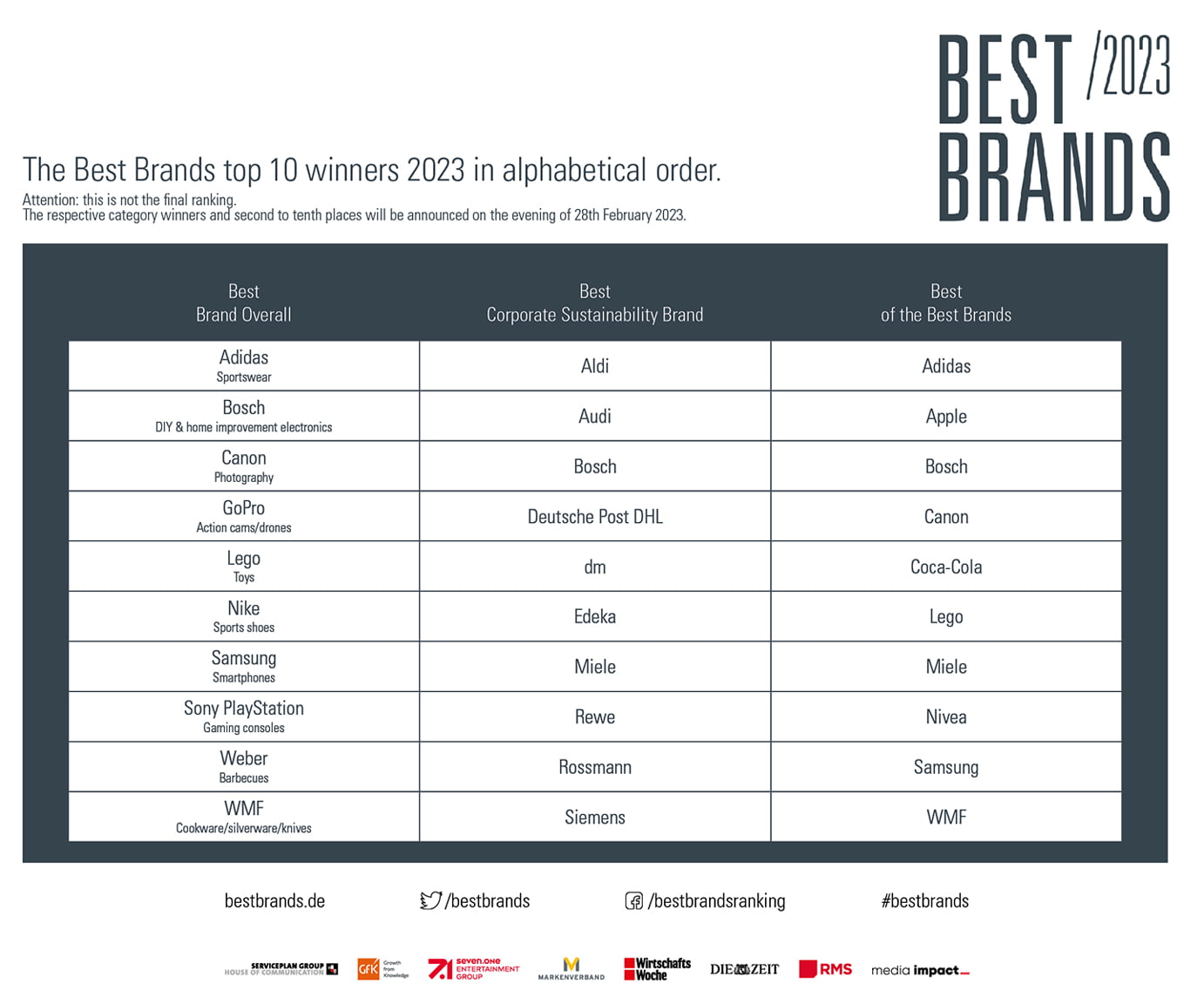 The winners in the three categories will be honored during the evening of February 28, 2023, at the Best Brands Awards ceremony at the Bayerischer Hof, and announced afterward with a press release.