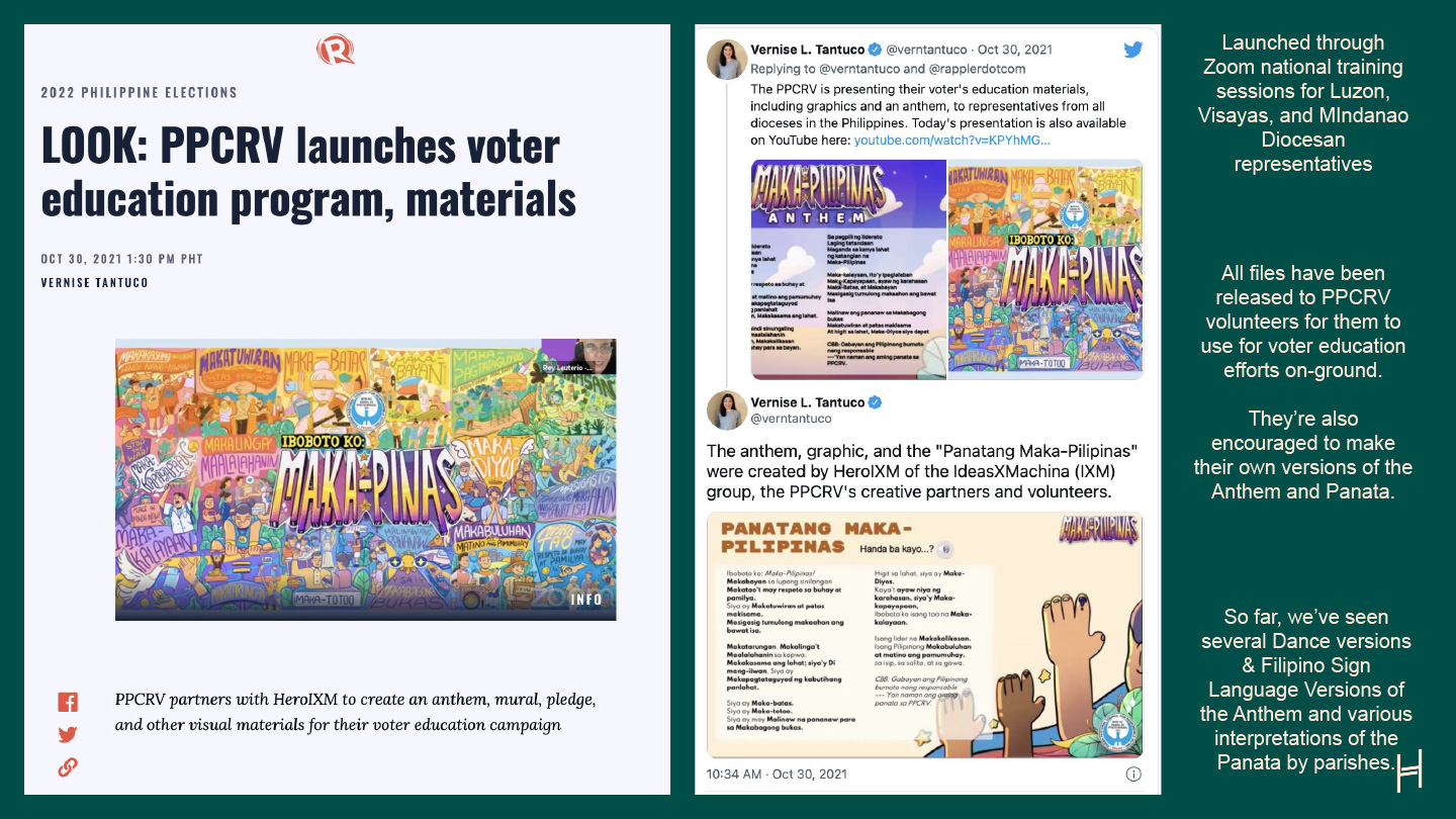 Our work for the Parish Pastoral Council for Responsible Voting in 2021 began with efforts for voter registration and progressed to their voter education campaign. PPCRV’s 16 Values to look for in candidates for higher office were translated into materials that everyone can understand. The Iboboto ko, Maka-Pilipinas campaign had an anthem, lyric video, pledge video, murals, social media posts, helping PPCRV’s effort to reach voters take on a youthful and engaging tone. Parish voter education volunteers were encouraged to make the campaign their own by making their own versions of the official materials. So far, we’ve seen them contribute a Filipino Sign Language version, a dance version with original choreography for the anthem, while a parish has created their own version of the pledge video.