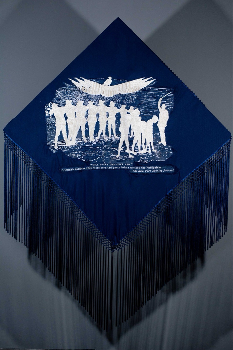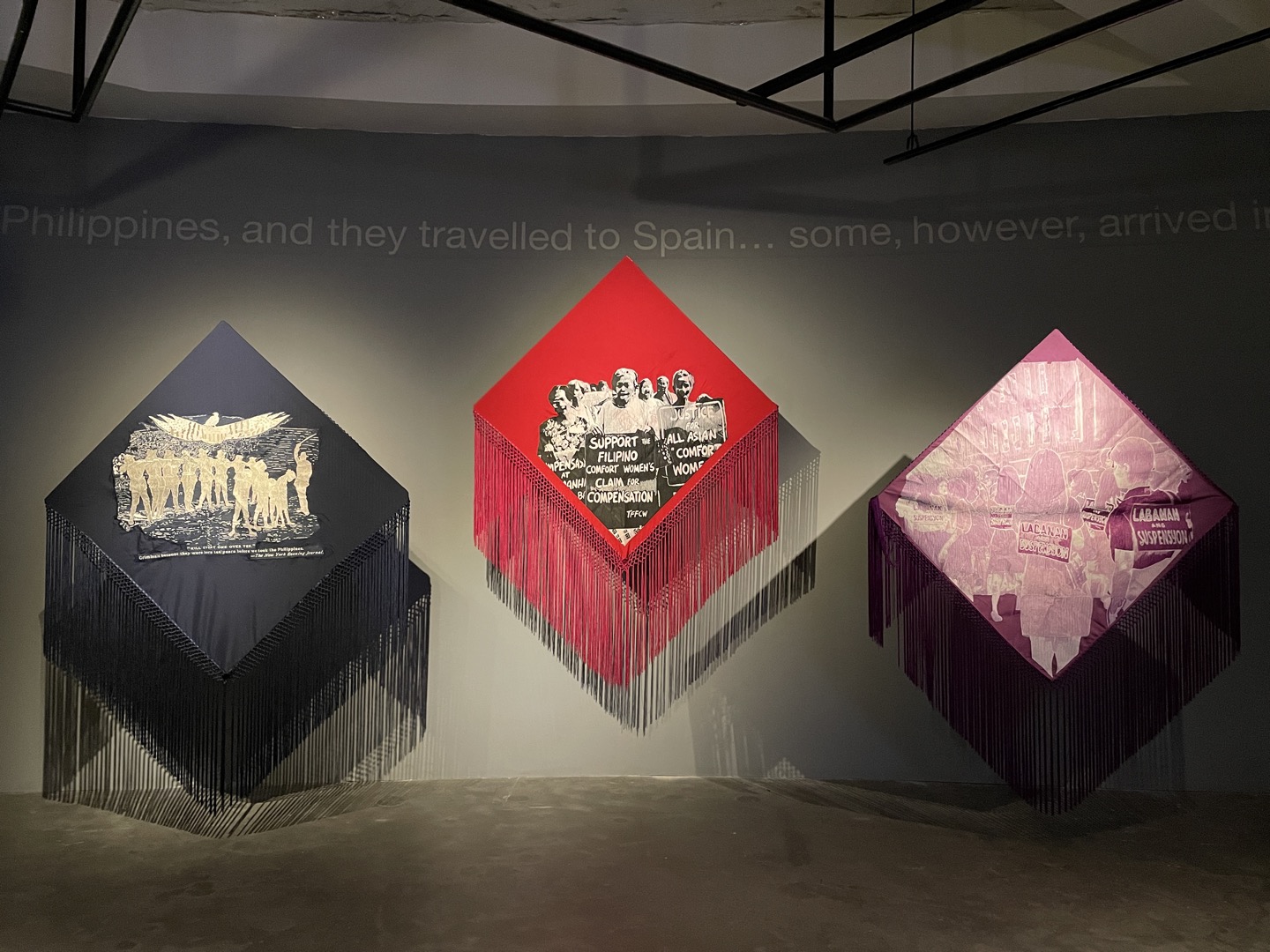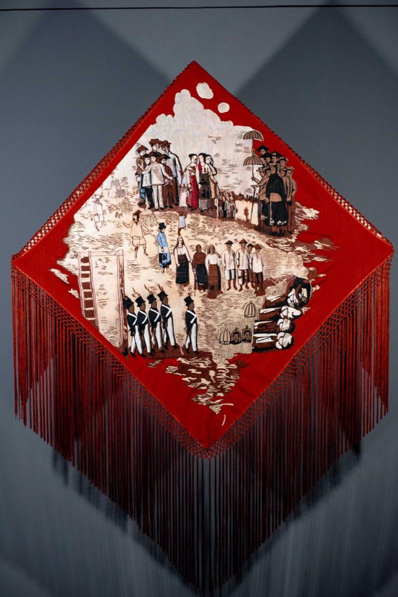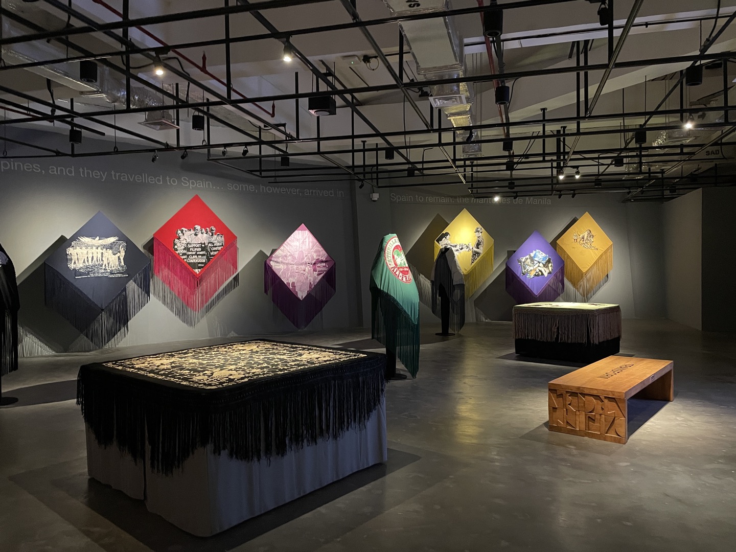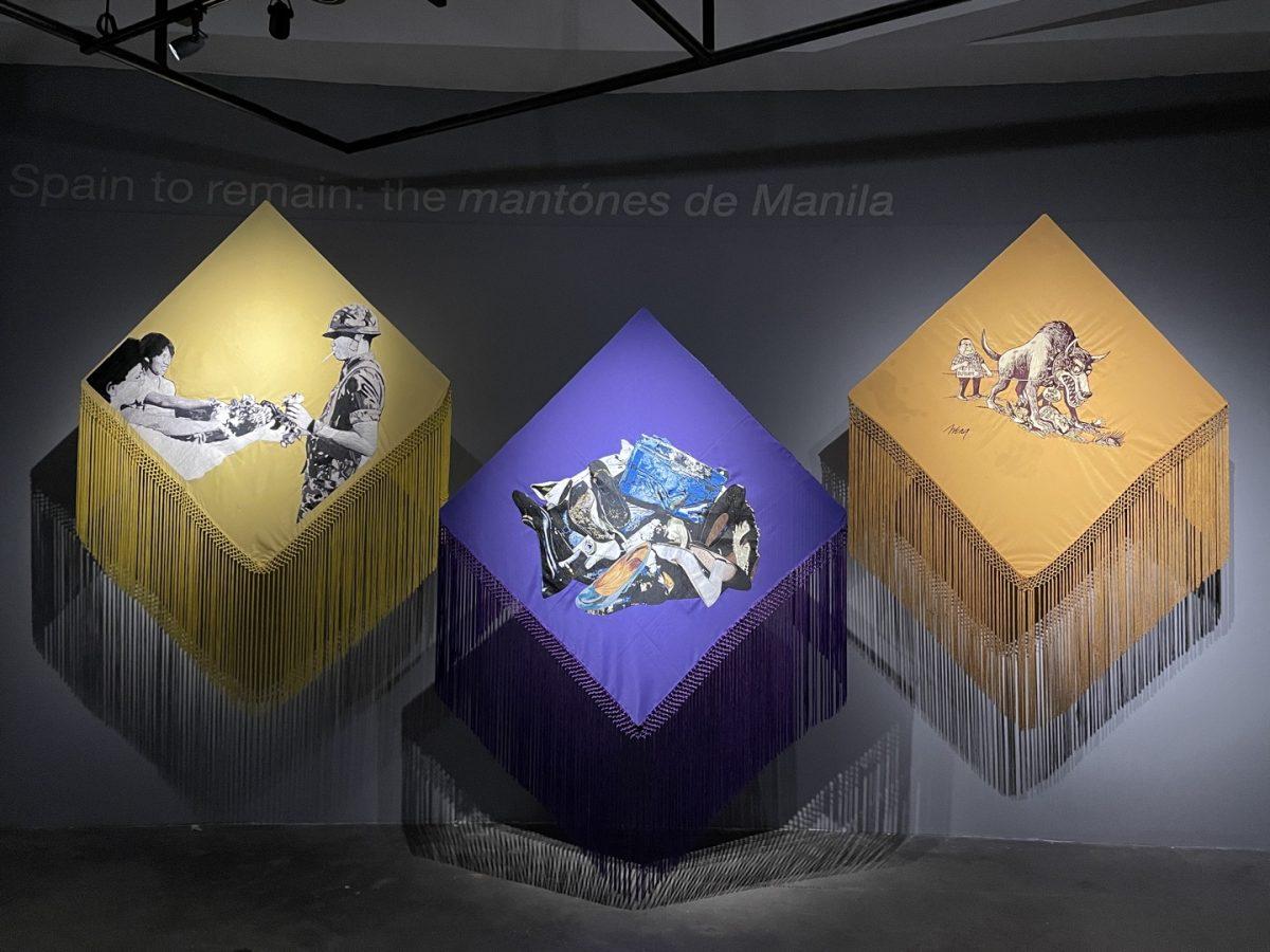 The Mantones, locally embroidered in Lumban, Laguna, are fifteen shawls that feature images that represent different points in Philippine history, current events, and popular culture. Malas Hierbas are a set of ceramic plates manufactured in Sevilla which bear botanical drawings of invasive plant species brought in from the Americas, alluding to the effect of colonization. The medallions fabricated in Sevilla are called Portable Monuments to Emigrant Anonymous Workers; they are conceived as a tribute to unrecognized Filipinos living overseas.These projects are contextualized by archival photographs as well as artifacts loaned from the Rizal Library of the Ateneo de Manila University and the Intramuros Administration. Manuel Ocampo also contributes his version of the Murillo Velarde – Nicolás de la Cruz Bagay map that depicts critical points in Philippine colonial history.