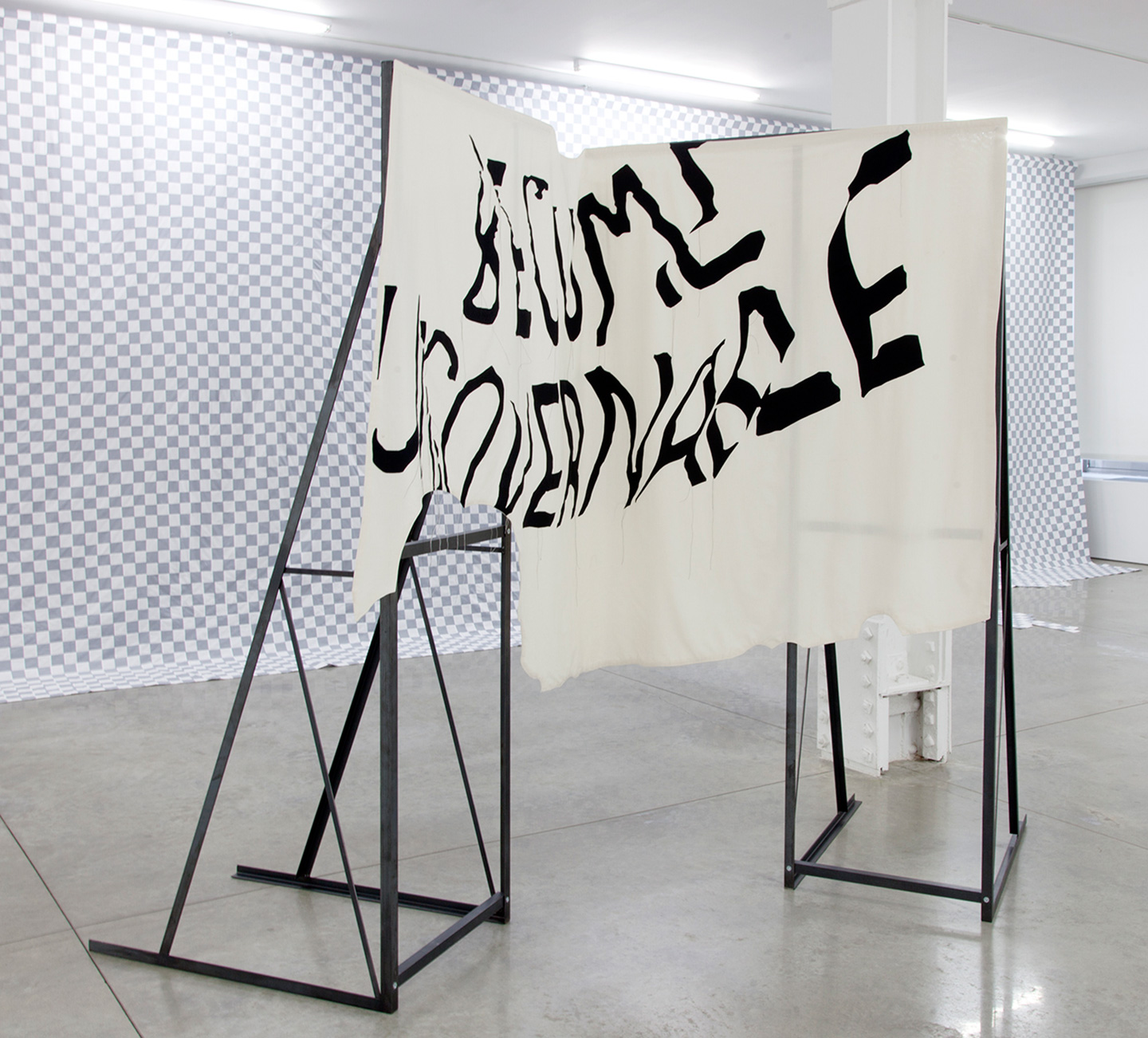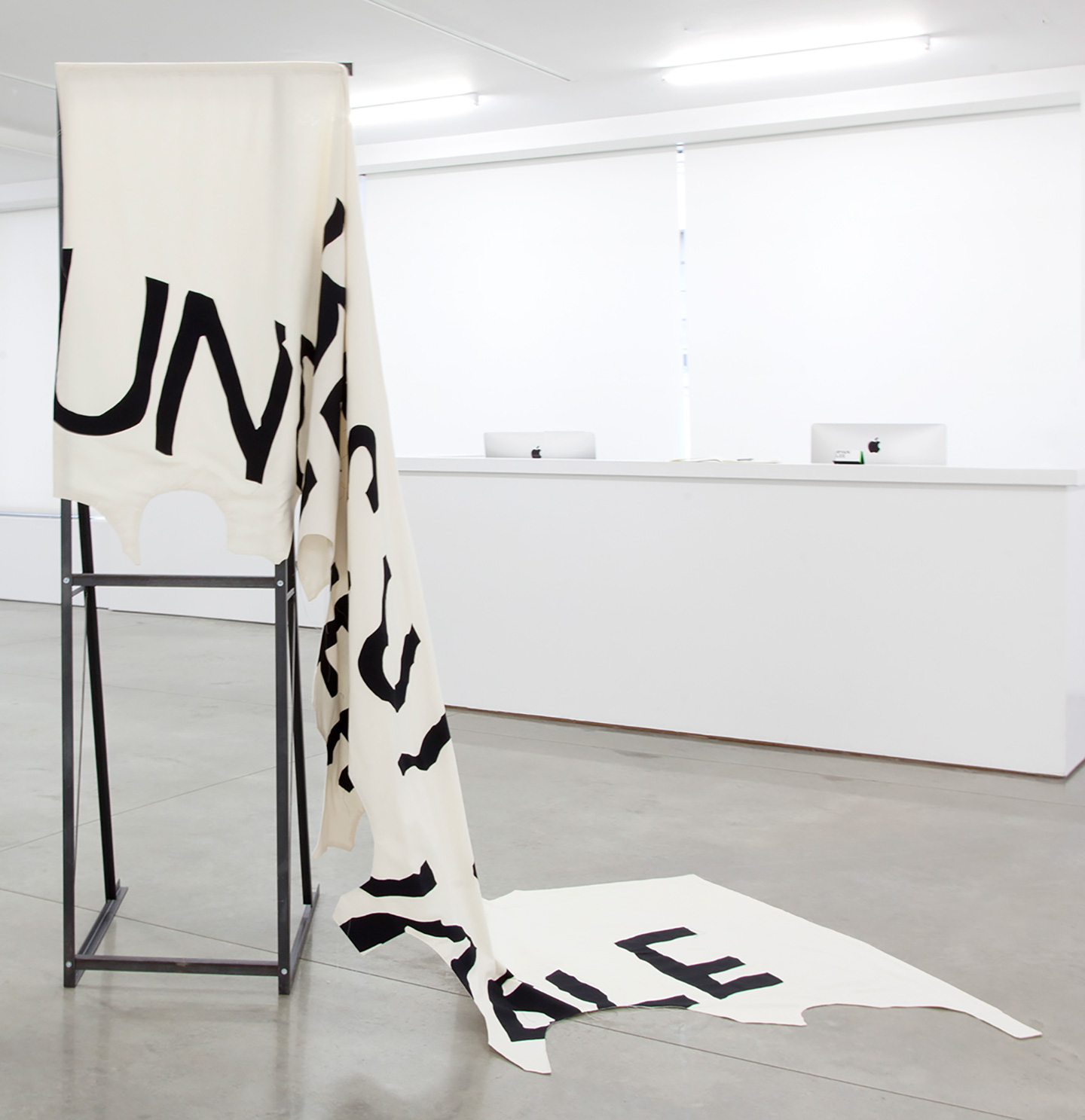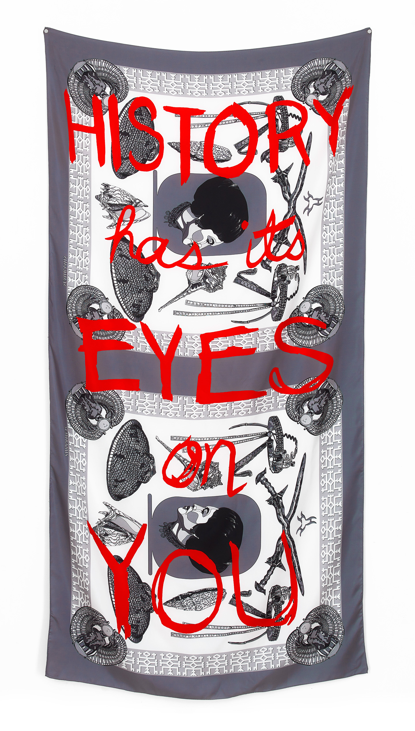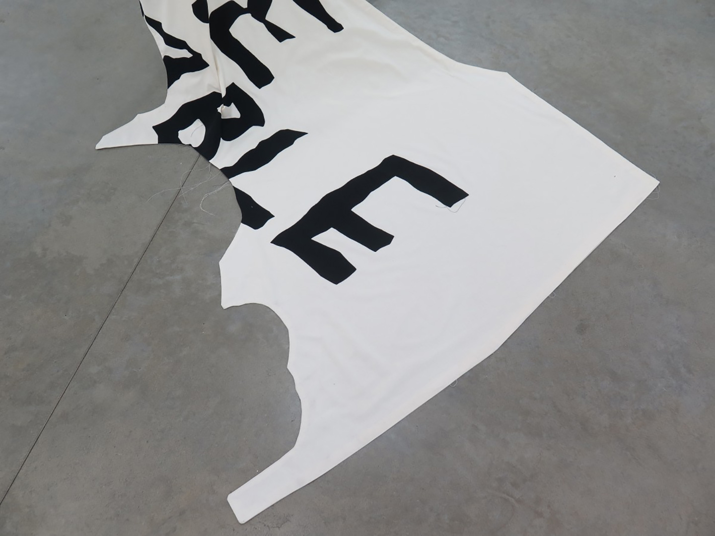 The material components of the show share the same skin as those found in the streets steeped in the climate of outrage and dissent: banners, photographs, textiles—inert objects that, through the artists’ fierce subjectivities, are transformed into vehicles of of chronicle and commentary, able to traffic within the discursive spheres of the social and the political. Their approaches are wildly different: Abad, through the mechanized language of seriality, disassembles and desecrates Marcosian iconography while Syjuco reconfigures the slogan of resistance through the transformative labor of human hands.