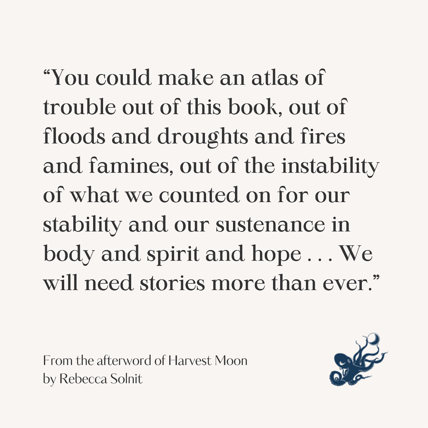“You could make an atlas of trouble out of this book, out of floods and droughts and fires and famines, out of the instability of what we counted on for our stability and our sustenance in body and spirit and hope. One of the questions that arises for me is what will sustain us through this period. We will need stories more than ever.”