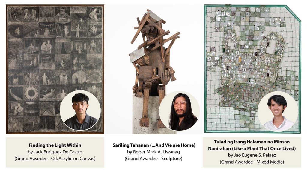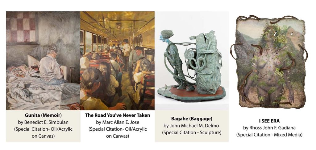 Special Citations were also given to John Michael Martines Delmo (Bagahe) and Rhoss John Farro Gadiana (I See Era) for Sculpture and Mixed Media, respectively. In the Painting category, Marc Allan Elizan Jose (The Road You’ve Never Taken) and Benedict John Iñigo Simbulan (Gunita) were likewise recognized.
