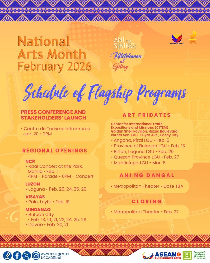 This year’s National Arts Month honors Filipino creativity and artistic expression under the theme “Ani ng Sining: Katotohanan at Giting.” Anchored on the goals of the Philippine Development Plan for Culture and the Arts and the UN Sustainable Development Goals, it highlights the role of the arts in fostering peace, truth, and inclusive development.