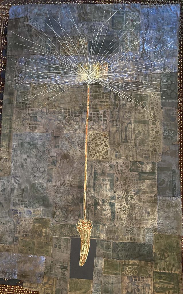 Collaged collagraphs and relief prints on pieced and overdyed repurposed cotton fabric
