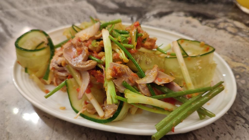 The main course was, in many ways, an experience unto itself. The Sambal Timun was served first, and immediately caught this writer’s attention with its spice level—this was not for the weak of tongue, but in the best way. The heat of Chef Daniel’s sauce opens up the taste buds for all the other flavors the dish brings to the table, from the sheer umami of the thinly sliced pork rolls to the pleasant gaminess of the chicken gizzard slivers. Stalks of green onion provide a punch that awakens the nose, while slices of cucumber tame the tempest of bold flavors, creating a powerful, though not overwhelming, experience on the palate.