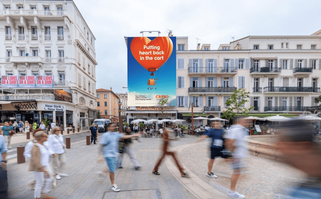 - Sky-High Symbol: A large orange heart–shaped hot air balloon billboard featuring a shopping cart and the line “Putting heart back in the cart” debuts along the Croisette.