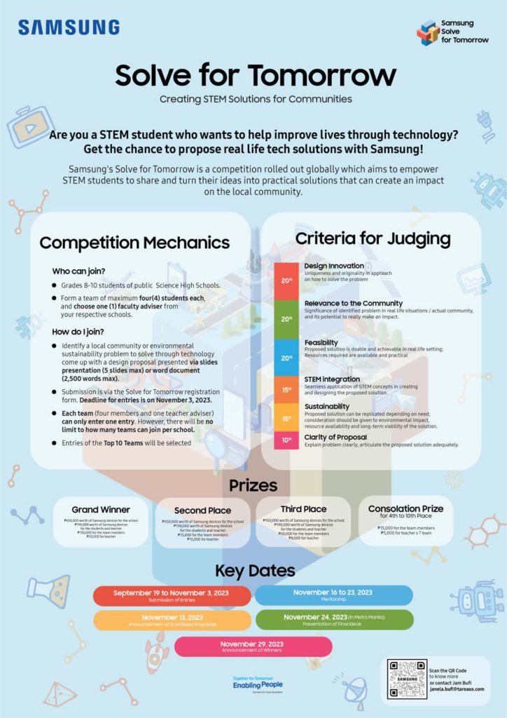 Join Samsung in its mission to help build a better future and be part of the country’s very first Solve for Tomorrow competition. The deadline for submission is November 03, 2023. Interested applicants can learn more and submit their entries at the Samsung Solve for Tomorrow here.