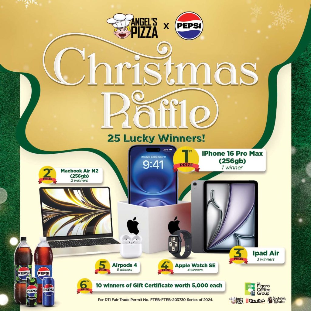 From October 15 to December 31, customers who visit any participating Figaro Culinary Group (Angel’s Pizza, Tien Ma’s, and Koobideh Kebabs) branches nationwide and purchase any food items with Pepsi Cola products will receive a raffle stub for every single receipt transaction for a chance to win a brand new iPhone 16 Pro Max and more.