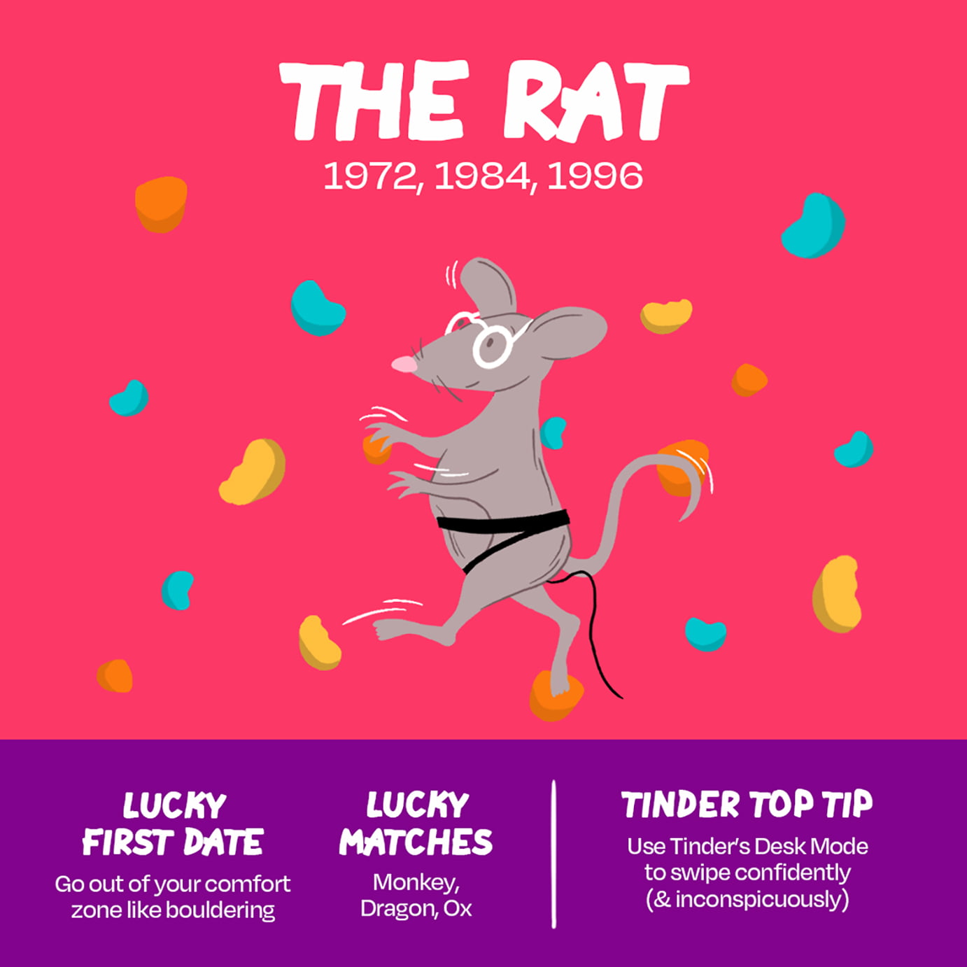 RAT – Love does not need to take a back seat while your career flourishes this year. Your excellent Love Luck will give you the extra “oomph” you need to make yourself irresistible to the matches you meet, so let the charm you have at work translate into all aspects of your life – including your dates!
