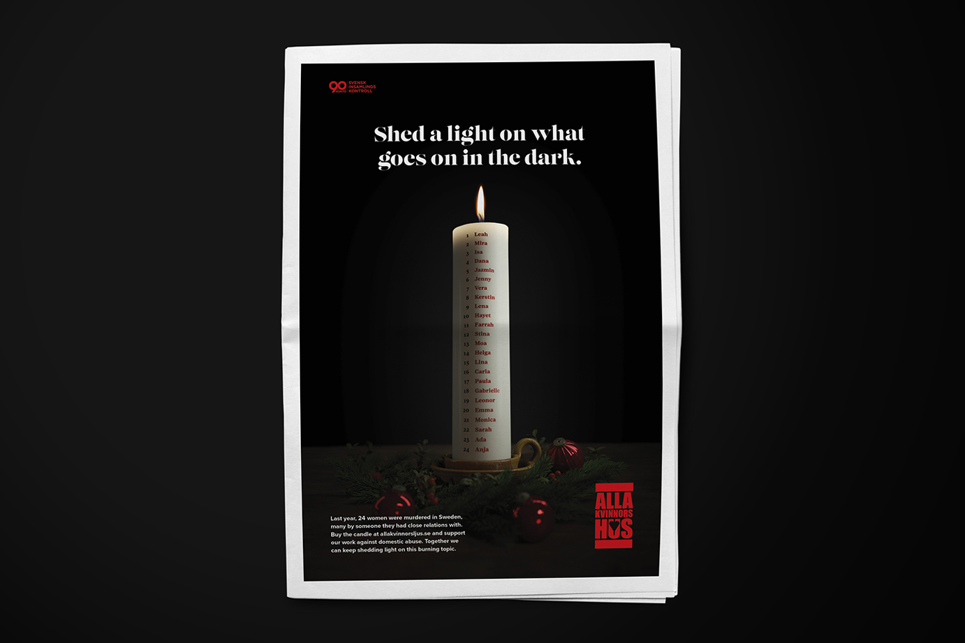“Alla Kvinnors Hus plays an important role in helping adults and children who have been victims of domestic violence. Their tireless commitment has inspired and touched us deeply. We are very proud to highlight their important work with this campaign and get more people to support them. In the communication of the campaign, we highlight a classic Swedish Christmas phenomenon, the advent candle, but the cozy feeling is quickly replaced when you see the following names and understand the context,” said Oskar Ferm and Lia Merkel, lead creatives at Familjen.