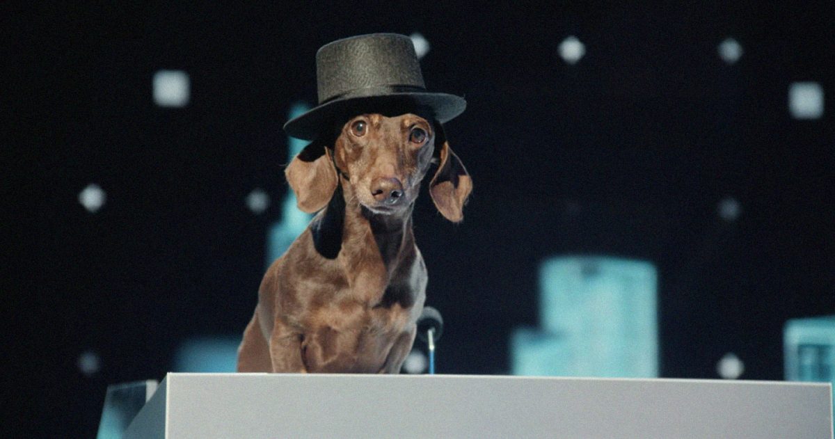 The film opens with a political news broadcast covering the presidential debate for 2034. The anchor presents the first two candidates in a seemingly normal fashion before arriving at the third candidate – a social media influencer – who also happens to be a dachshund in a tophat. While the crowd goes wild for the dog (who goes by Mr. Doodlesworth), we cut to a young man seated at home watching who can barely believe what he’s seeing.