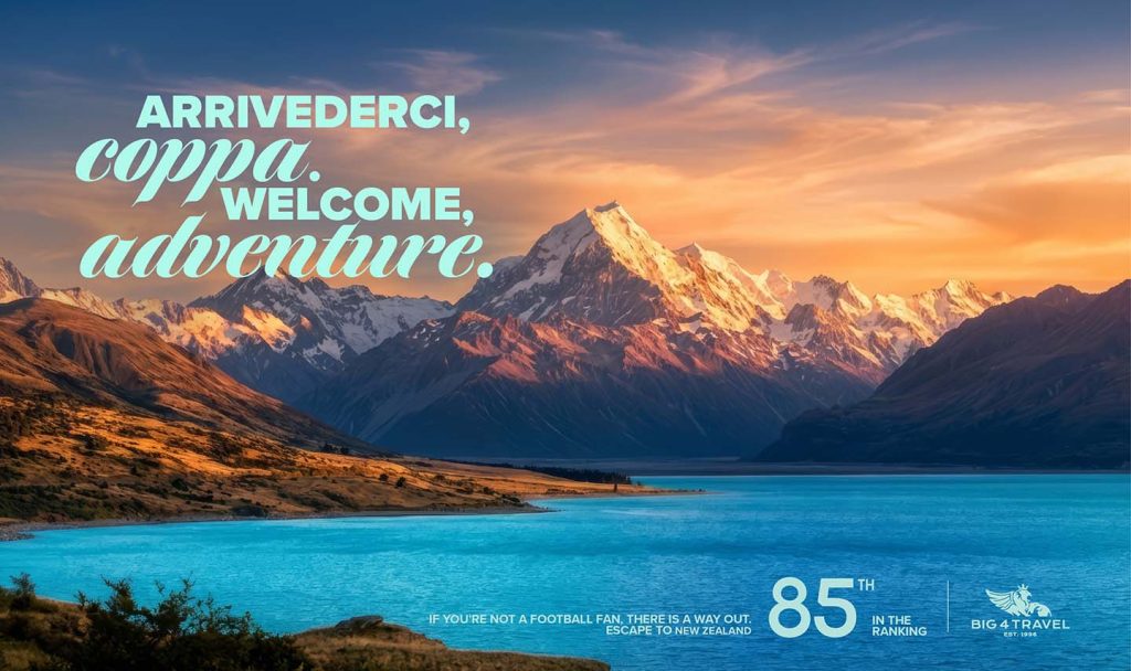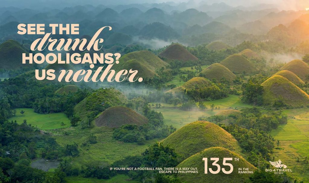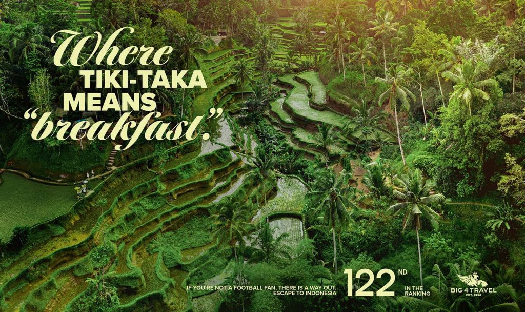 The work spanned OOH, social placements, and the publication of a cheeky travel guide to “The Non Qualified Countries” where Big4Travel offers its holiday packages; amplified by journalists and travel influencers, and targeting audiences looking for an alternative to the tournament rather than a way into it.