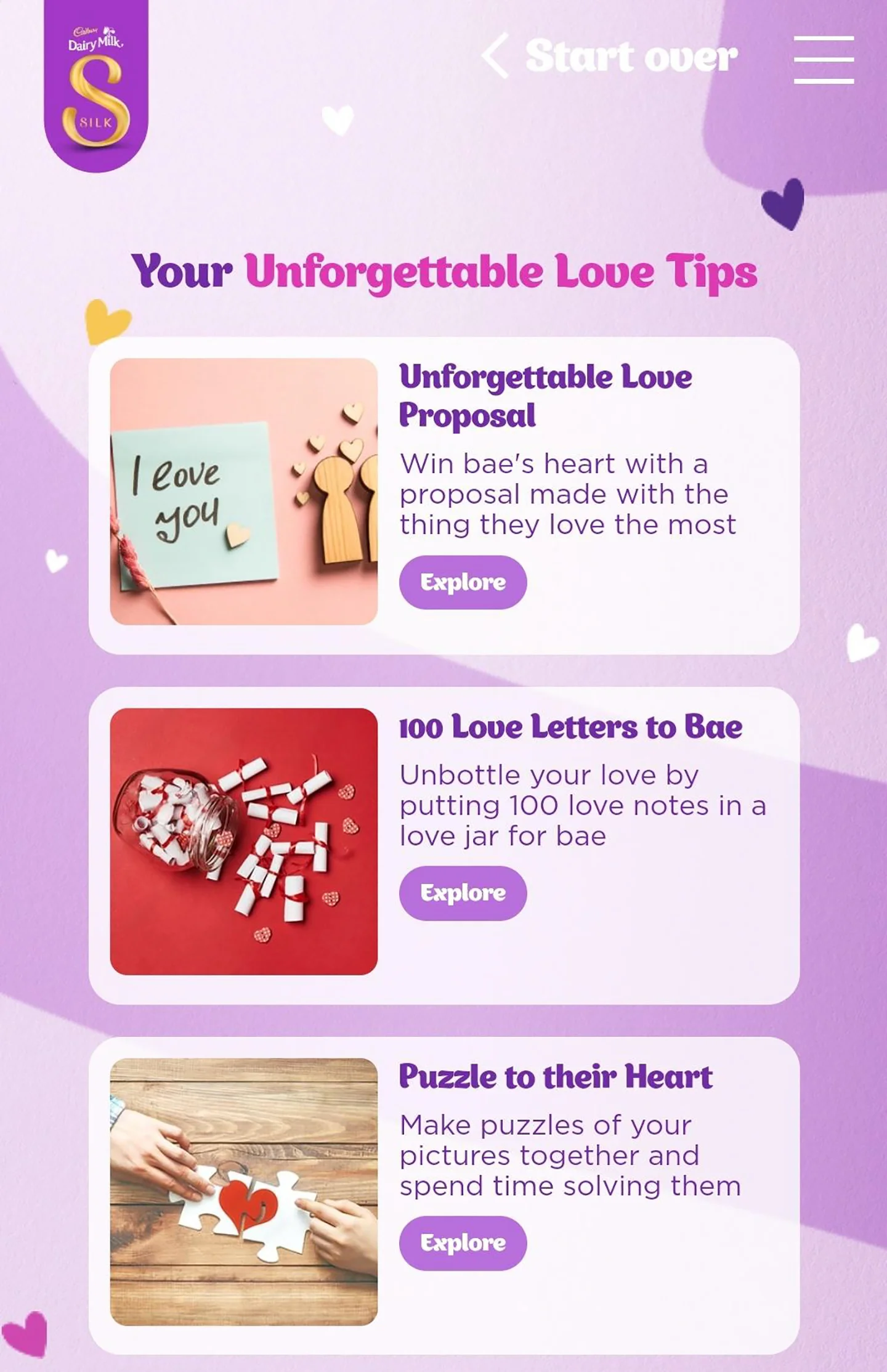 As per a Google Lighthouse study, there’s been a 50% spike in search trends for personalized gifts during Valentine’s Day. To save young hearts from the mounting pressure of making this day extra special, Cadbury Dairy Milk Silk plays cupid once again by taking the digital route and leveraging its website. Whether it’s to help someone profess their love for the first time or add a dash of love to an existing relationship, Silk’s Unforgettable Love Tips is here for everyone.