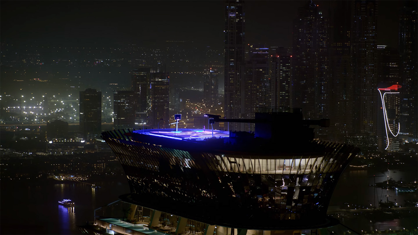DUBAI, UAE — Celebrating the latest Impossible Is Nothing chapter in Dubai, adidas built a basketball court 250m above Dubai for its new I’m Possible activation. With the city’s skyline in the background, the glow-in-the-dark basketball court pulsates on top of a 52-floor tower at the heart of the iconic man-made island, The Palm. Built using hundreds of UV black lights, LED panels and glowing-in-the-dark paint, the construction took about 100 hours of work on the ground. To give a complete scale of the feat and show the full palm, a film was shot from a helicopter more than 1,524m above ground.