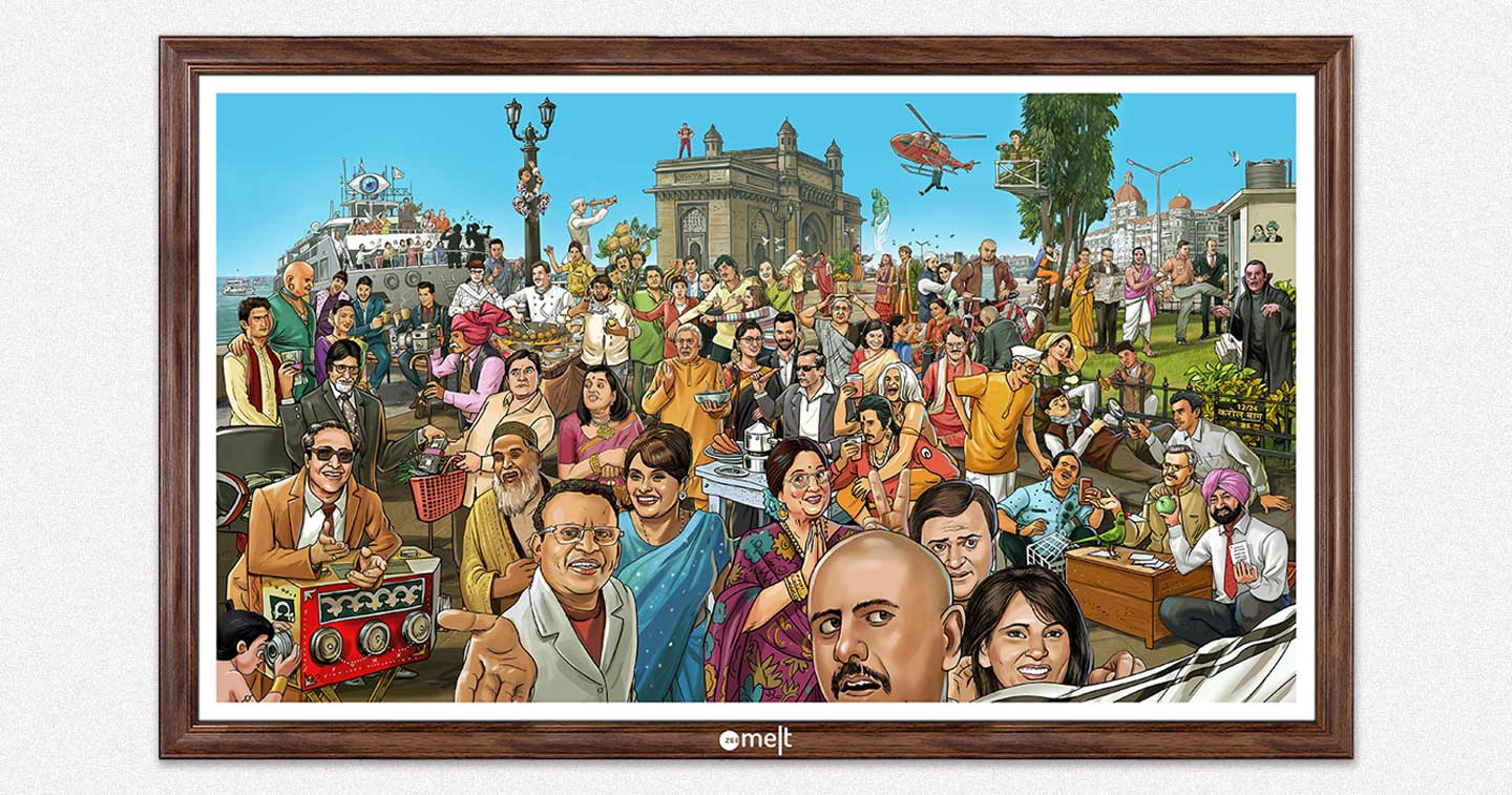 The poster is a gathering of memorable characters from 58 of India’s most iconic TV shows set near the historic Gateway of India promenade in a vibrant illustration style. It brings back memories of TV shows that were broadcast across Doordarshan and Hindi GECs from the unforgettable Bharat Ek Khoj to today’s Big Boss and KBC.