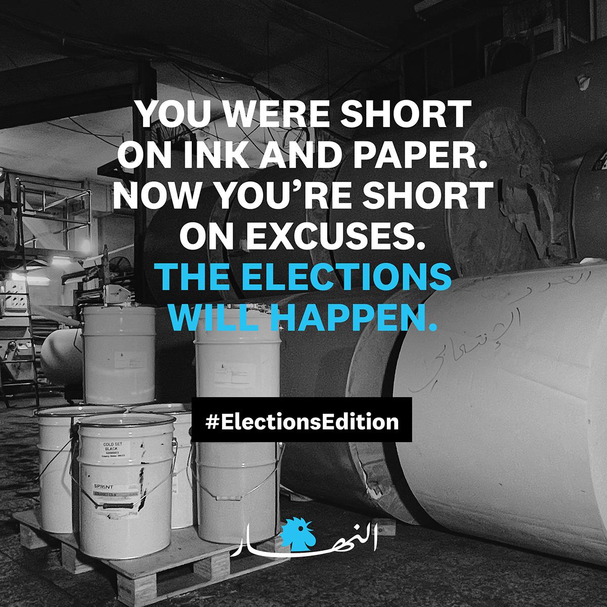 Nayla Tueni, Editor-in-Chief, said, “We’ve been hearing that there is not enough ink and paper to proceed with the elections for a while now. Well, that is no longer an issue. The resources we saved by not printing for one day provided a truckload of paper and ink to support the upcoming elections. There are no more excuses. The elections are happening, no matter what.
