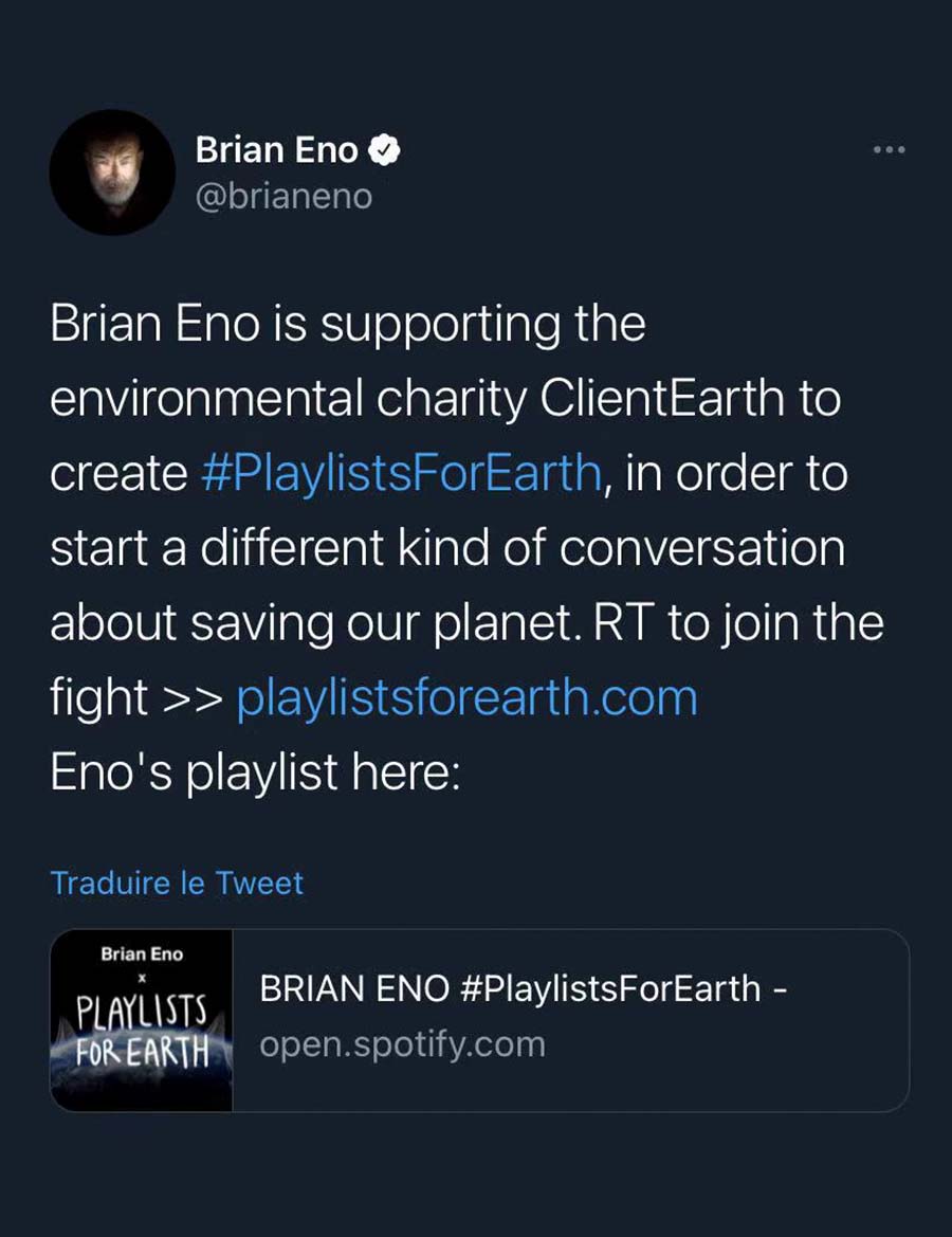 Over 60 international artists have pledged their support to Playlists For Earth including Coldplay, Brian Eno, Anna Calvi, and more – they are spreading this message of hope to their fans and community with the official hashtag #Playlistsforearth across Instagram, Twitter and Facebook. Since yesterday dozens of international artists and influencers have already started using their social networks yesterday to engage millions of fans.