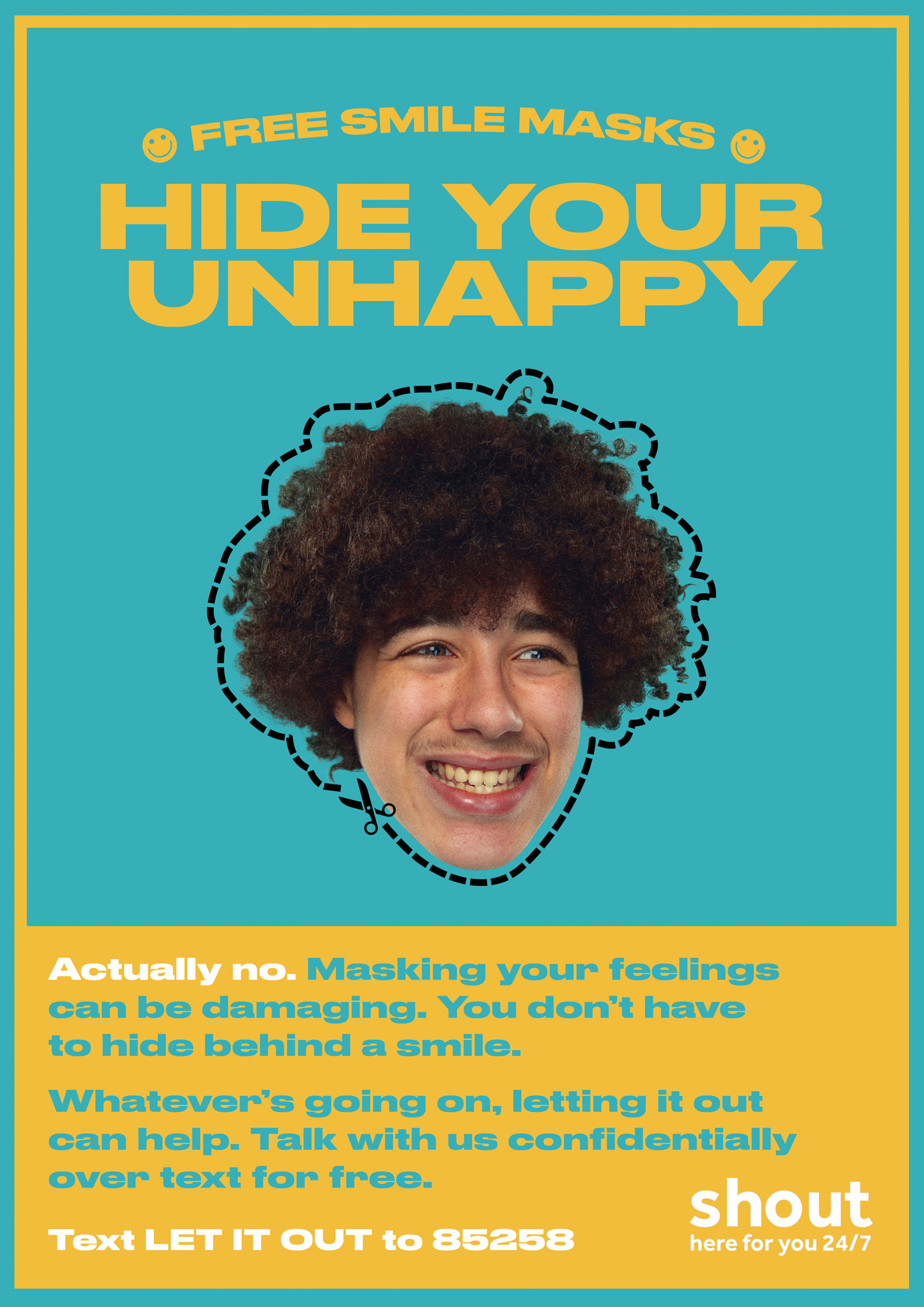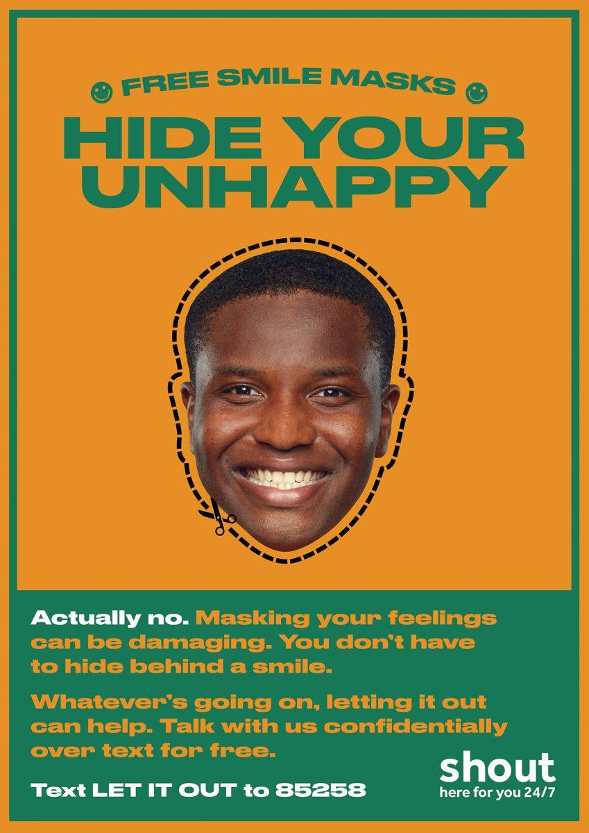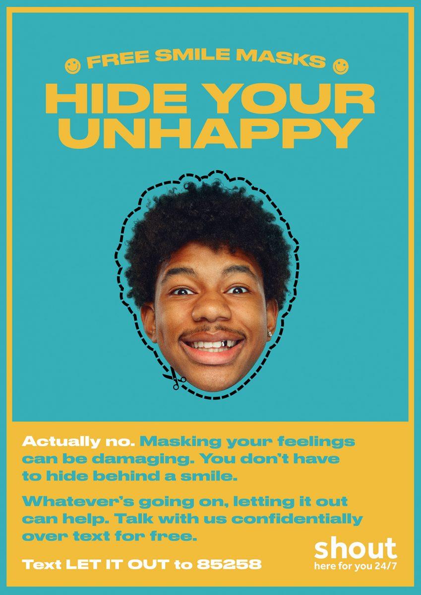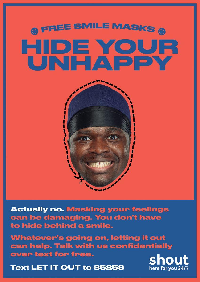 The campaign explores the insight around masking emotions through two different executions. The first is ‘Hide Your Unhappy’ masks, a campaign which uses a provocative headline to grab the attention of a new demographic for the Shout helpline, which until now has been used mostly by young white women. The marketing campaign offers ‘Free Smile Masks’ depicting the faces of smiling young men to help you ‘Hide Your Unhappy’. On the back of each mask is a message telling people that they don’t need to hide behind a smile, urging them to talk over their problems with Shout by texting LET IT OUT to 85258.