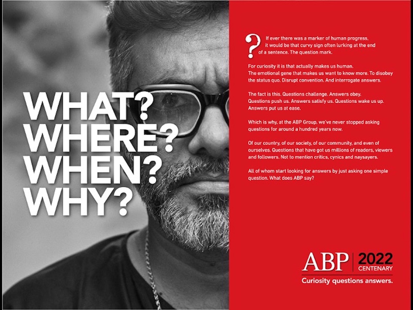 To mark their centenary this year, ABP Group has launched an audacious new campaign that seeks to capture their unspoken essence of curiosity and questioning. Using the tagline, “Curiosity Questions Answers,” the campaign underlines ABP’s tradition of seeking new truths and challenging old ones.