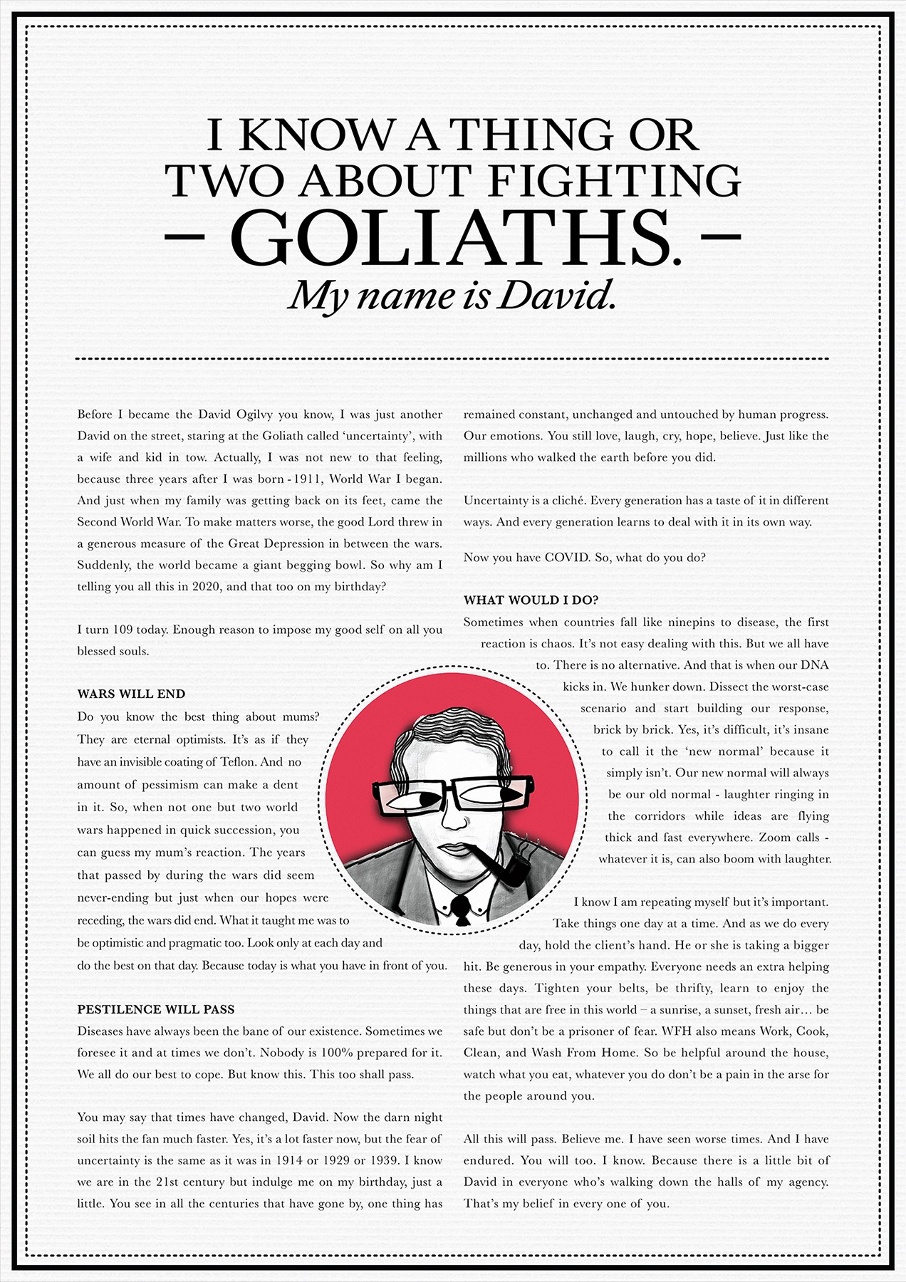 MUMBAI, INDIA – Ogilvy India is celebrating its legendary founder’s 109th birthday in a novel and a pragmatic way. Simply put, it’s this: what if David Ogilvy comes to life and shares his experiences about the tough times that he faced in his life? Two world wars and the great depression, and the lessons that he learnt from them.