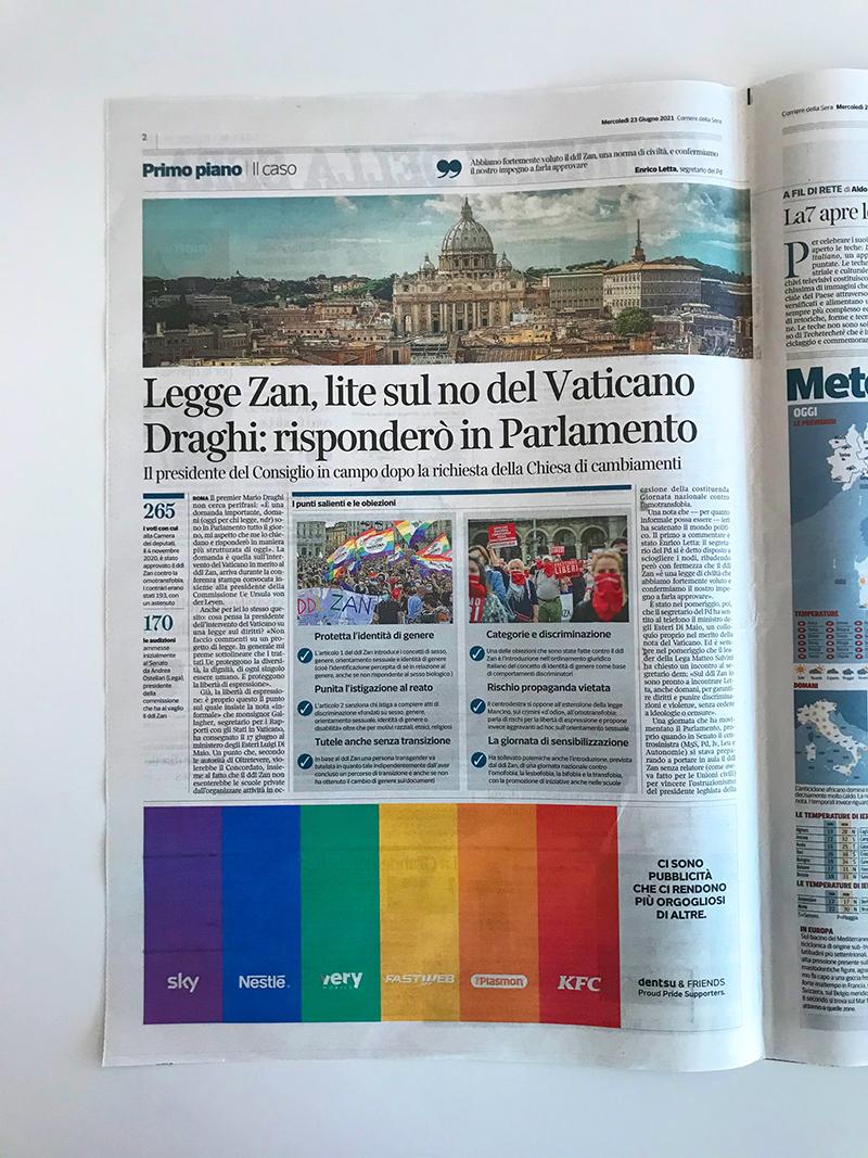 But most of all, it has been published on newspapers just below the news of the debate about Italy’s anti-homophobia law between government and Vaticans with a perfect media placement.