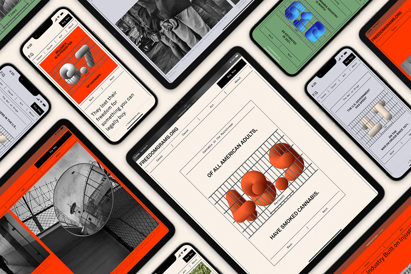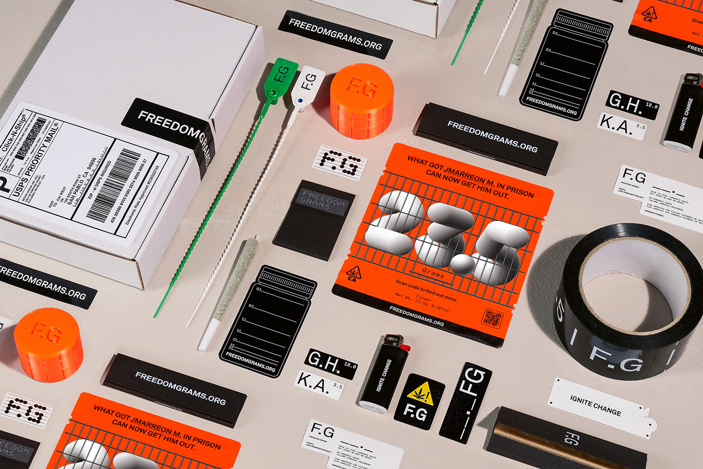 From the packaging to the website, Freedom Grams features elaborate design and high-end craft. The design system is based on prison bars from which generative typography literally breaks free, symbolizing the project’s theme of liberation. The labels are relief-printed and come with a custom branded matchbook. From lighters and rolling paper to stickers, hangtags, and a 3D printable grinder, a wide range of branded collateral was created for retail and influencer mailings.