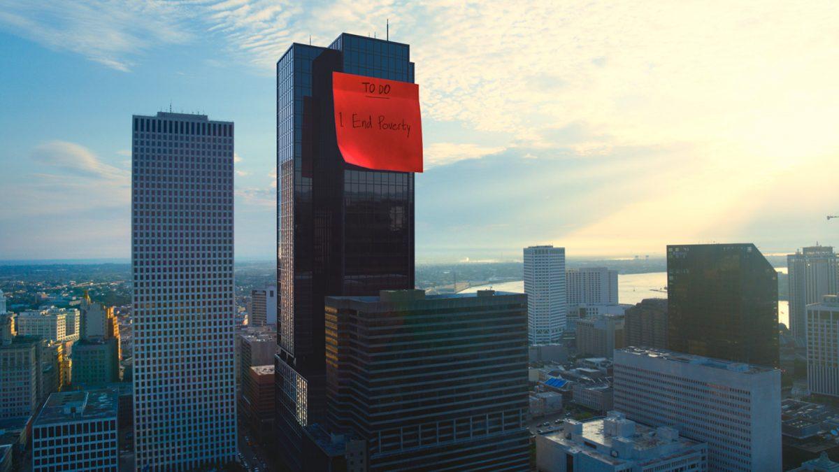 The campaign reframes the 17 Goals as “The World’s To-Do List” in order to remind people we have a blueprint for a better world. Each goal is hand-written on giant sticky notes placed in iconic locations across the globe and on billboards and projected onto buildings in major cities, from New York to Venice. The playful yet profound messages re-imagine the Goals as a series of short actionable ‘to-do’s’, setting a clear reminder that we have the plan to fix the world’s problems; we just need the action to get it done. The 17 ambitious tasks scrawled on the giant sticky notes include 1. End poverty, 2. End world hunger, 5. Achieve gender equality and 13. Tackle the climate crisis.