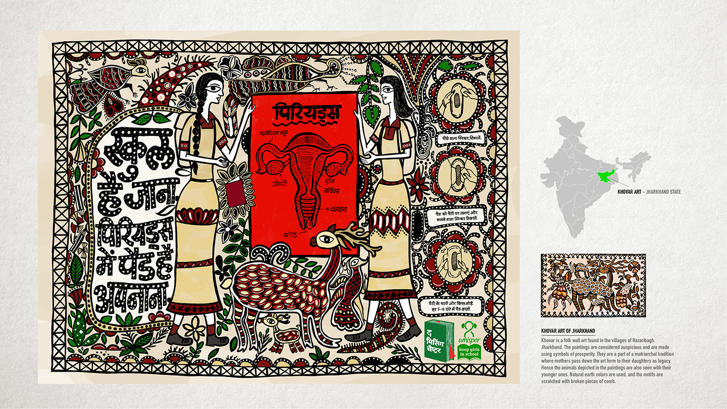 After identifying 28 art styles specific to the geography of each state, we worked with local artists to create custom hand-drawn paintings centered around “The Missing Chapter” on periods. Hyper-localized in 28 different languages, slogans with catchy lines were crafted to bust period myths along with a 3-step visual aid on how to use a pad. These paintings have been put up on school and village walls — a place no girl can miss seeing these. The missing chapter explains the simple biology behind periods, how to use a pad, and the importance of continuing their school education to girls. All done to help in triggering a much-needed conversation on menstruation to help #KeepGirlsInSchool.