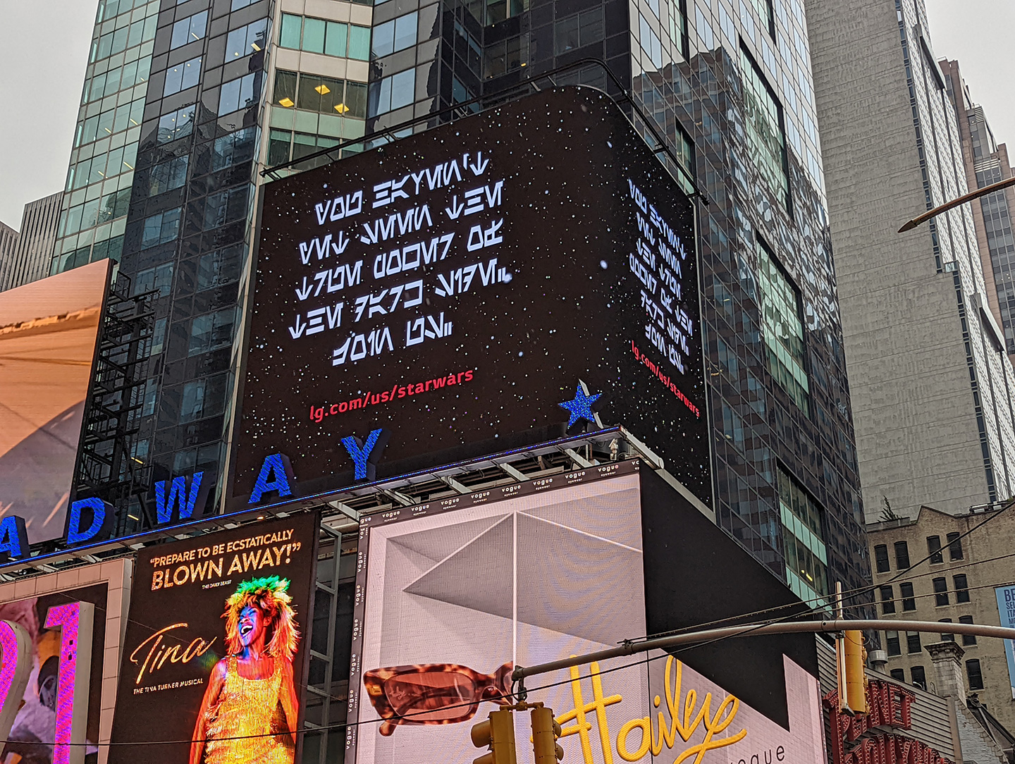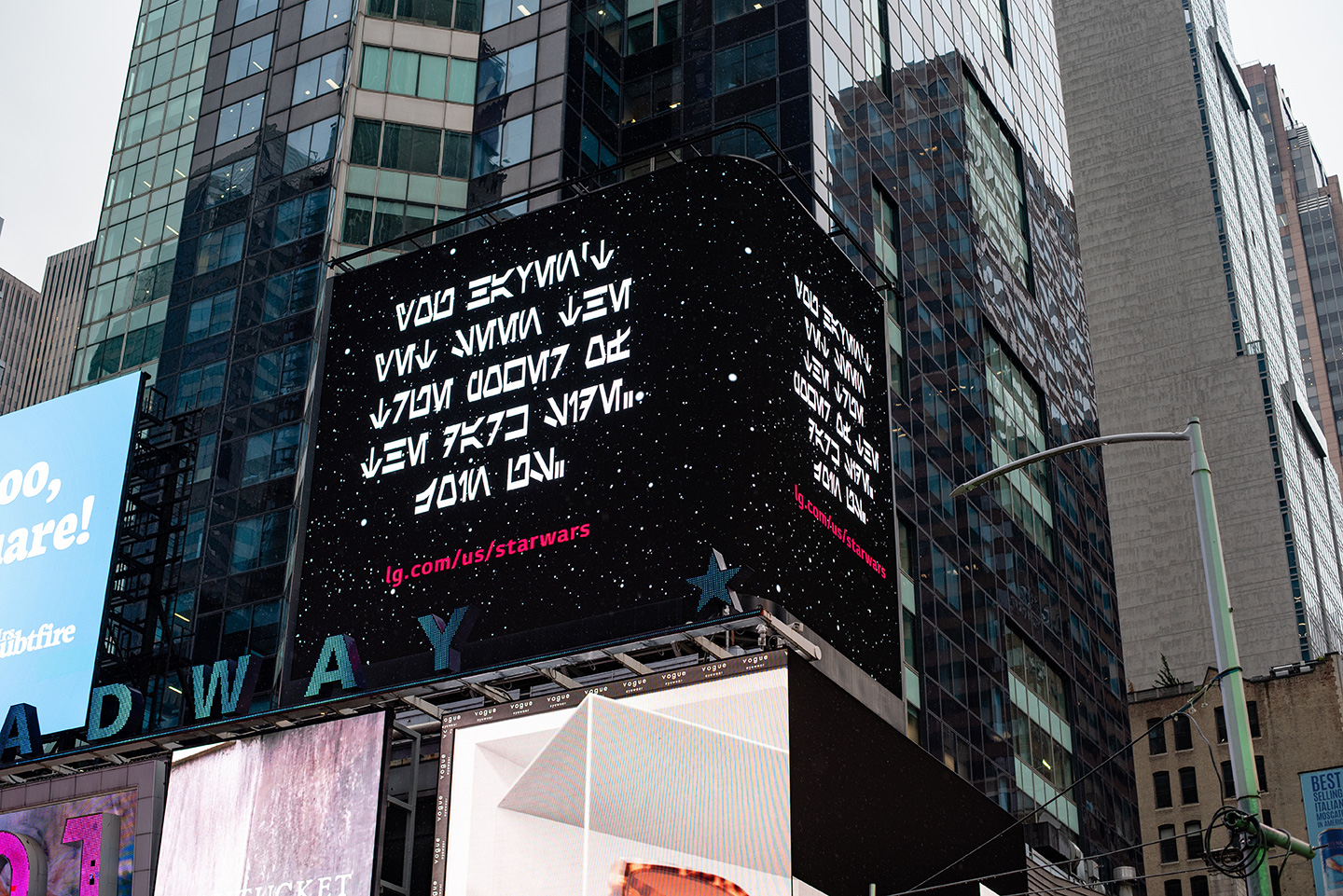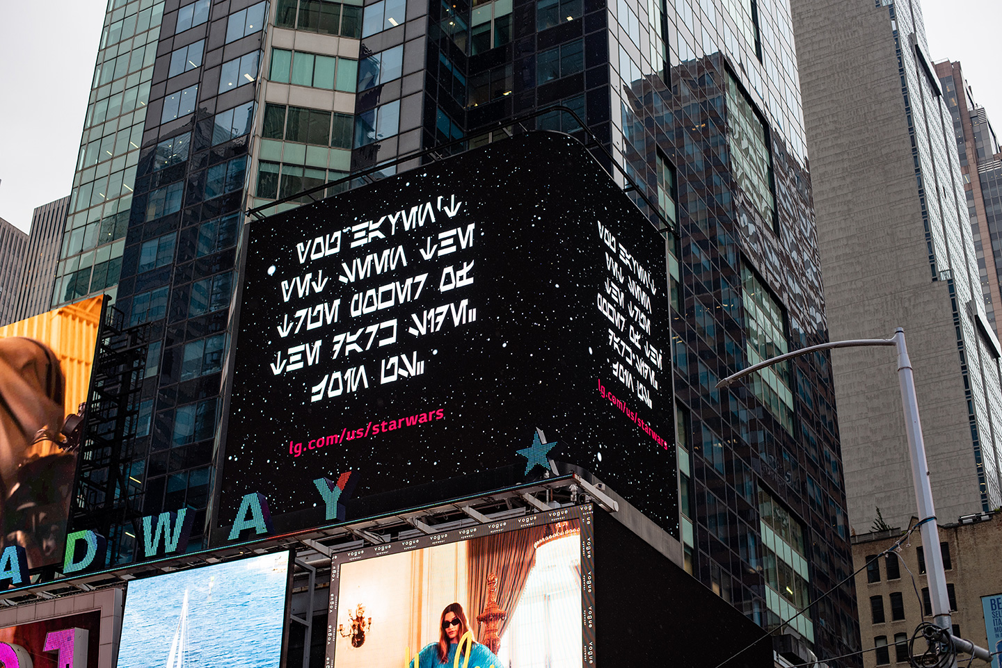 The announcement, which began appearing on LG’s digital billboard Times Square, featured a message in the Star Wars alphabet, “Aurebesh,” to alert fans about the launch of the unique collaboration between LG and the Star Wars franchise.