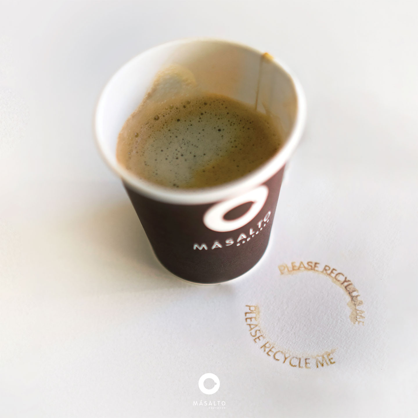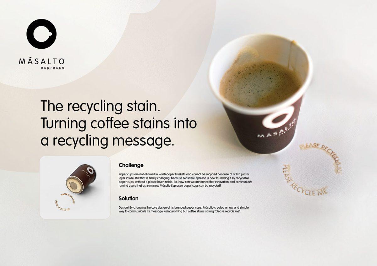 But that is finally changing because Másalto Espresso is now launching fully recyclable paper cups, without a plastic layer. And with the help of Belgian agency Happiness, the coffee brand has developed a sustainable and simple design solution to educate coffee drinkers to recycle their cups: The recycling stain.