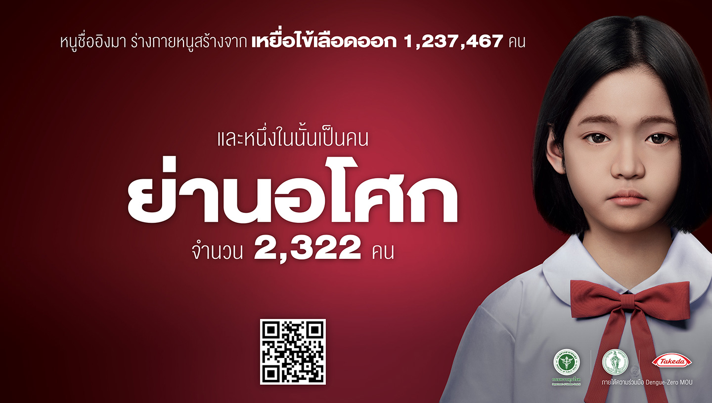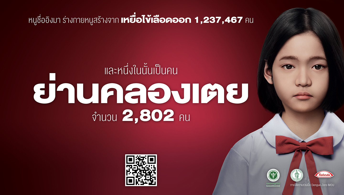 For this year’s Asean Dengue Day, CJ Worx, in collaboration with Takeda Thailand, the Department of Disease Control, and Bangkok Metropolitan Administration, has gathered data from 1,237,467 Dengue victims to generate the first Dengue Virtual Human, INGMA, to raise the awareness and communicate Dengue facts via many media platforms.