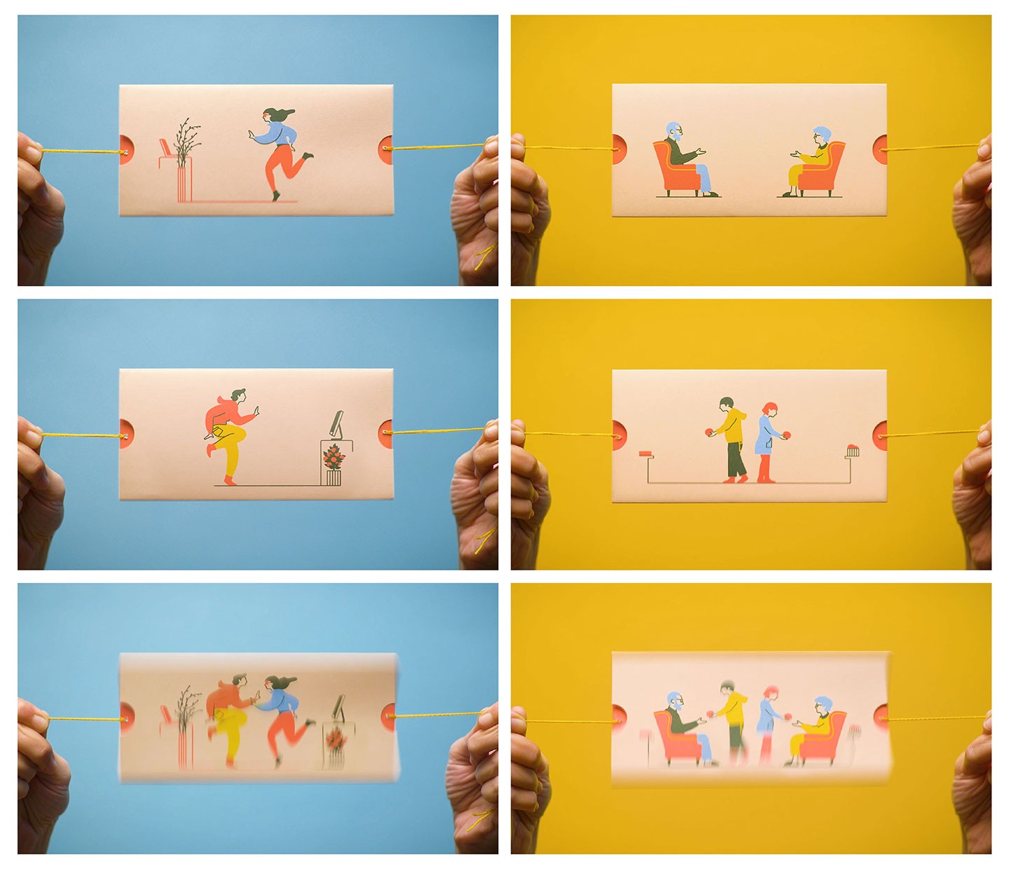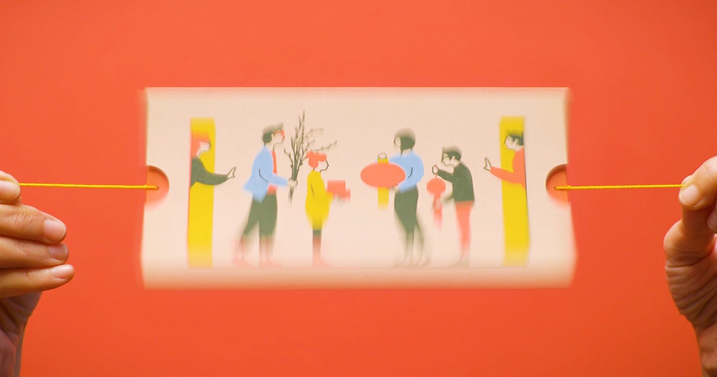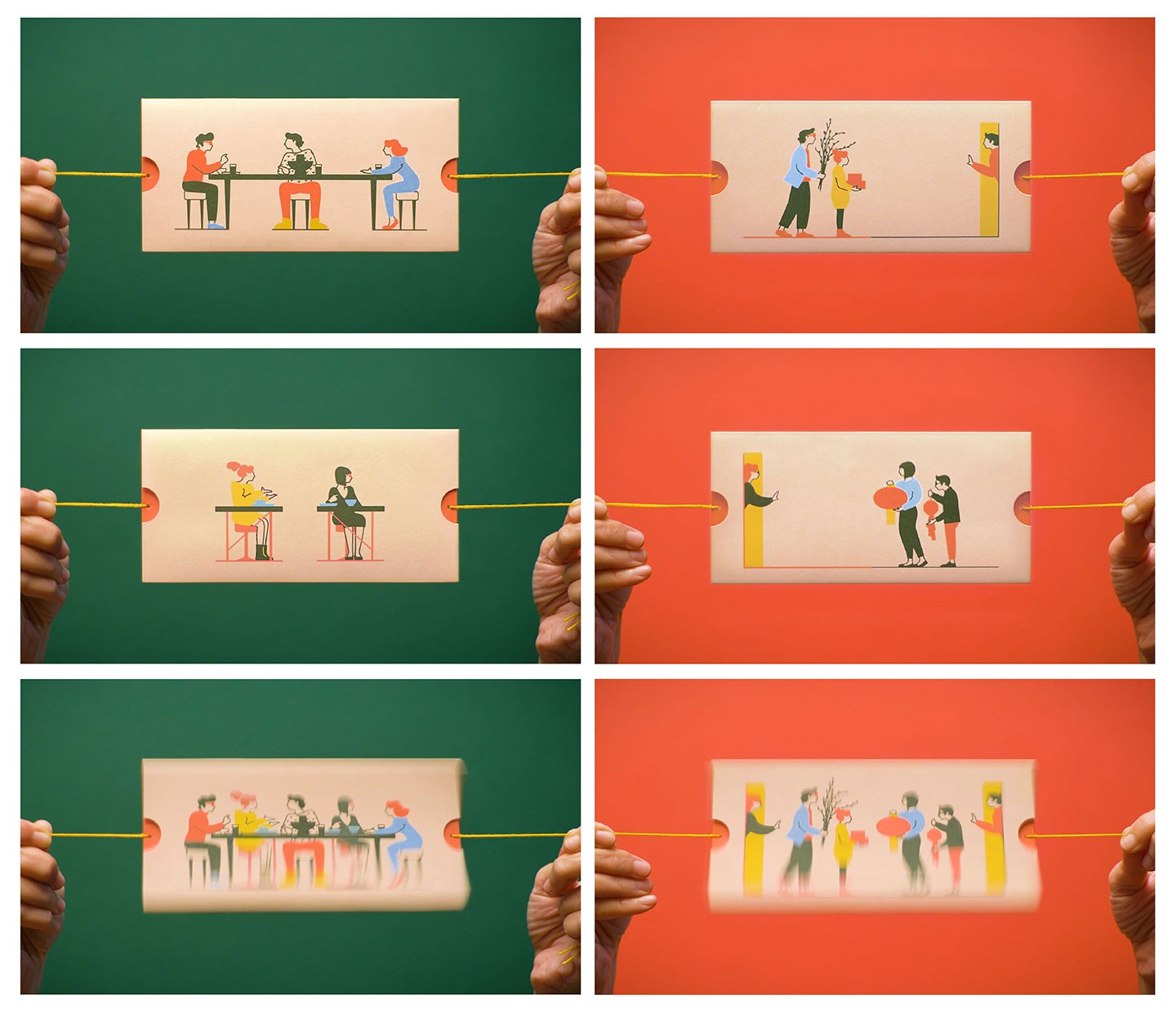 On first glance, the red packets feature festive scenes where people are socially separated on both sides. But the surprise comes when using the thaumatrope technique, the two images would merge together in an optical illusion to bring about a joyful reunion.