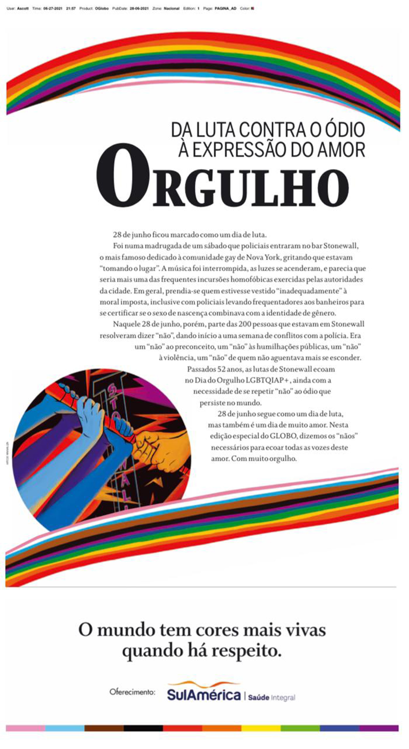 Every day, through its editorials, in print and online, O GLOBO has been deepening issues of the LGBTQIAP+ population in articles and actions under the values of respect for others and diversity, in its multiple manifestations. These are also values and principles shared by Grupo Globo and Editora Globo by creating internal selection processes and people development actions.