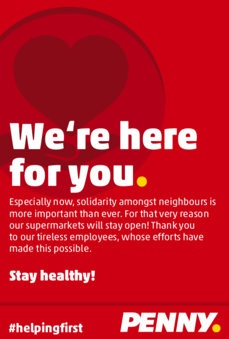 At the same time, PENNY calls upon all customers to support and take care of each other, such as providing practical tips and tools, for example templates for notes to put up offering help to neighbours.