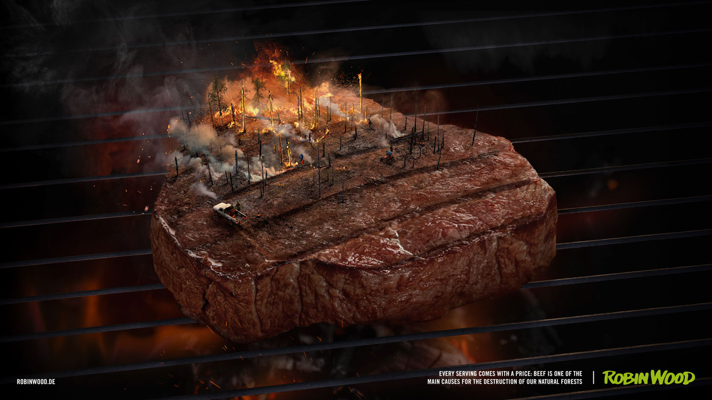 Munich, Germany — Using the claim “Every Serving Comes With a Price”, Serviceplan Campaign X has developed a campaign for the German environmental NGO ROBIN WOOD that illustrates the immense damage done to forest areas by deforestation due to cattle farming.