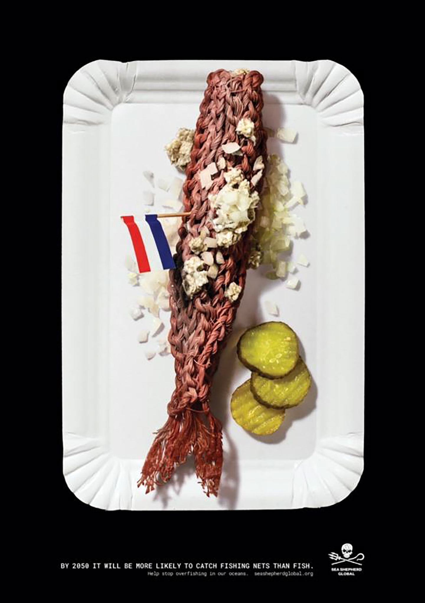 AMSTERDAM, NETHERLANDS — If people don’t stop overfishing, the oceans will soon carry more marine debris, such as fishing nets, than actual fish. To promote immediate action to save the ocean, Sea Shepherd and Ogilvy Social.Lab created the unique campaign “Catch Of The Day 2050” – displaying seafood created by fishing nets found in the North Sea.