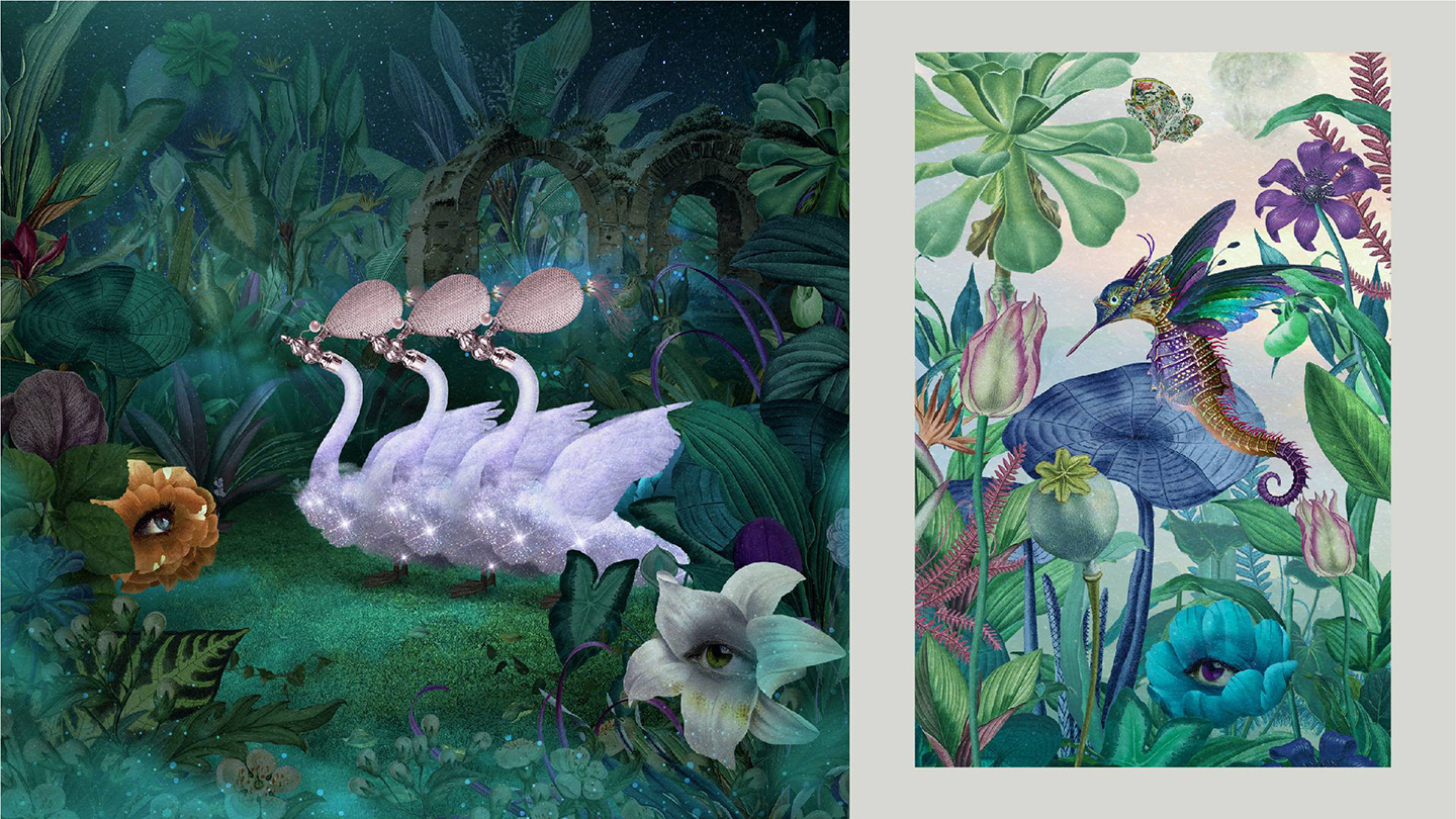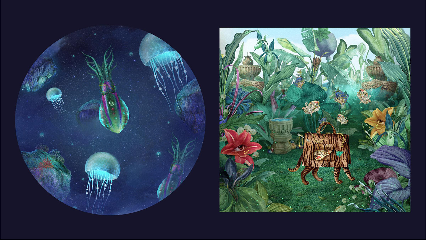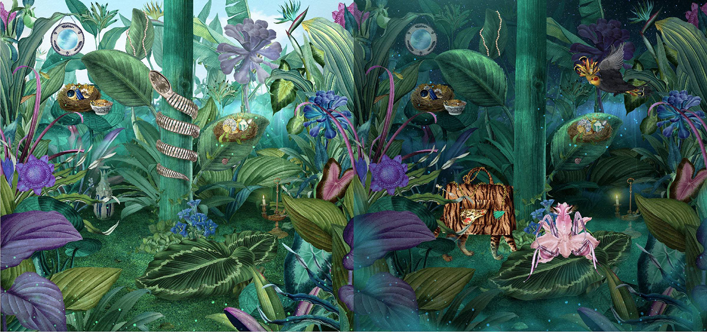Working in collaboration with Peru-based surrealist illustrator, Paolo Torres, Superunion created a poetic world inhabited by characters and scenes, designed through a whimsical combination of retail products and magical creatures. A Tiger tote stalks the rainforest and a Venus statue built of lipstick sits at the centre of a lake whilst porcelain whales dance in the sky. Each of these narratives was illustrated and brought to life in motion, designed to seamlessly exist alongside the store’s daily life. The scenes are highly intricate, with day and night cycles that reveal new discoveries through every view.