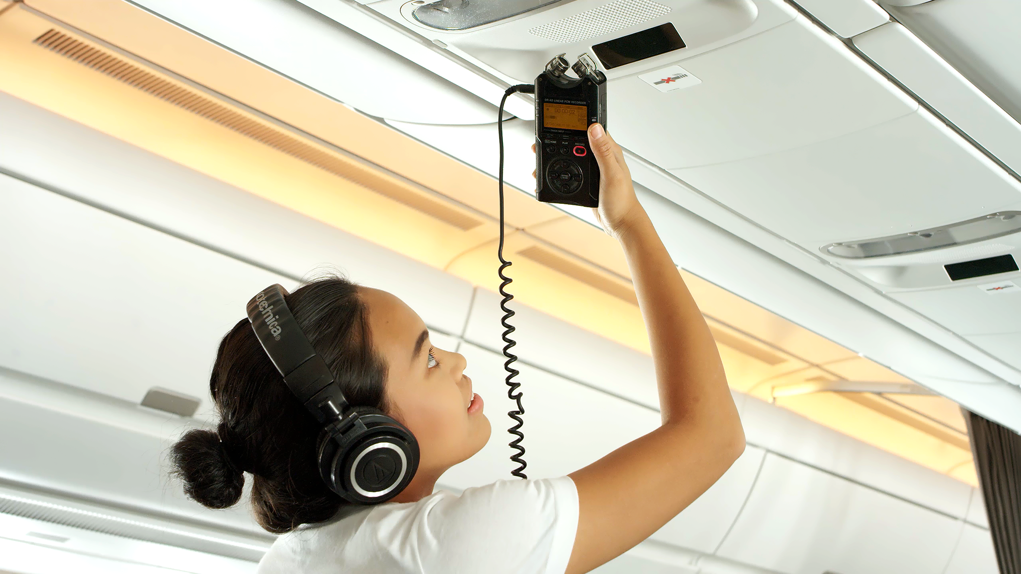 Chong explored the Airbus A350 from the cockpit to the tail and from the wheels to the engines, creating a library of sounds to compose her track. In total, she recorded over 45 different sounds. Many are recognizable to passengers – including the roar of the engine, clink clinks from silverware, the click of a seatbelt, the ding of the flight attendant button and even the familiar welcoming voice of the Singapore Girl. Other, less accessible sounds – including taps on the tyres of the Airbus A350’s nose-wheel, or the whirrs and ratchets of