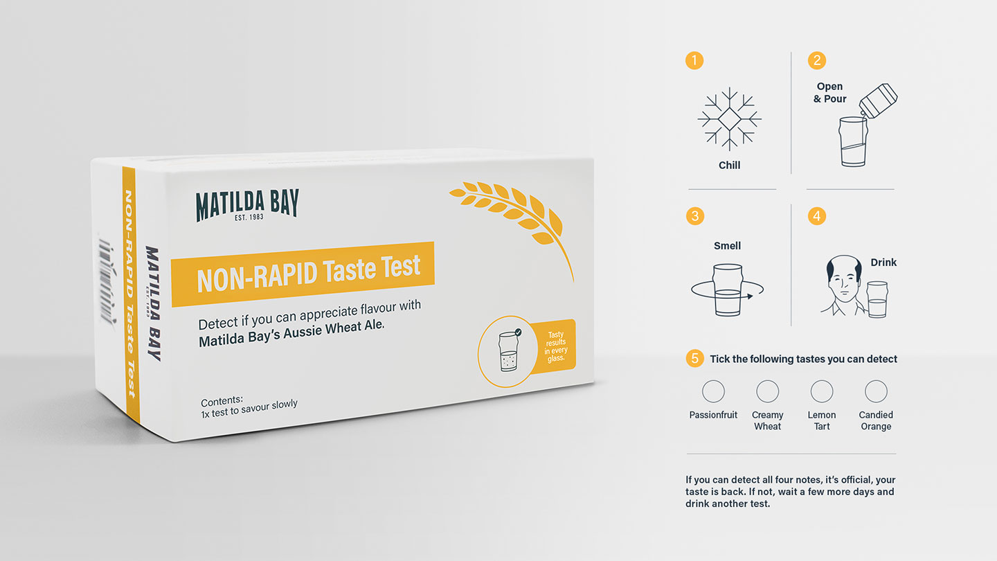 Unlike the familiar rapid test, Matilda Bay’s “non” rapid test comes with a delicious can of Aussie What ale, along with an instructional tasting card that helps users determine if they can appreciate flavor again.