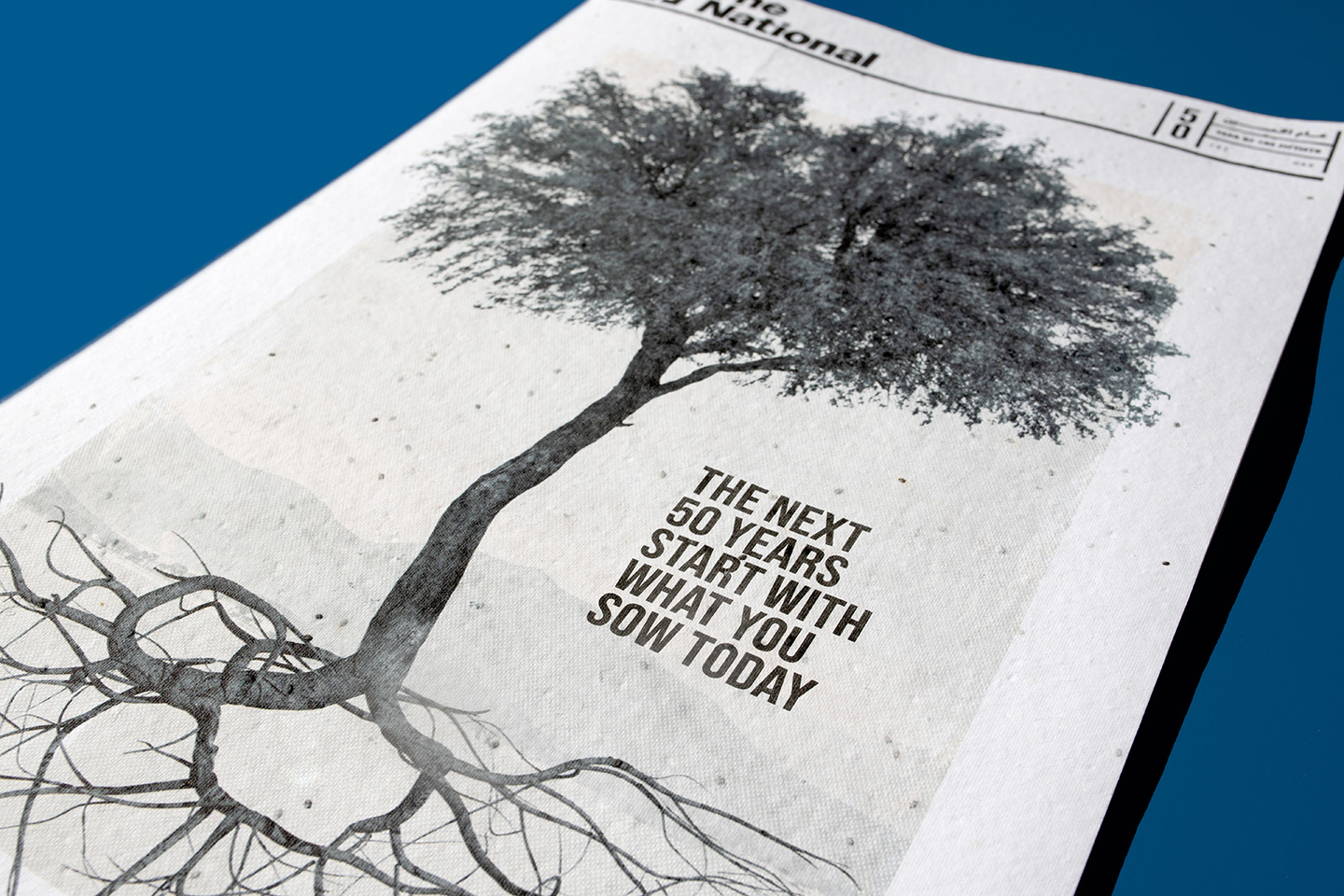 “The UAE has welcomed us all with open arms and supported our dreams of a better tomorrow. On the nation’s golden Jubilee, we at The National are honored to celebrate both its sustainability vision and one of its symbols, the Ghaf tree, an emblem of union, hope, life, and stability, by printing the country’s first-ever plantable paper.” — Mireille Puskulian, Head of Marketing and Communications at The National.