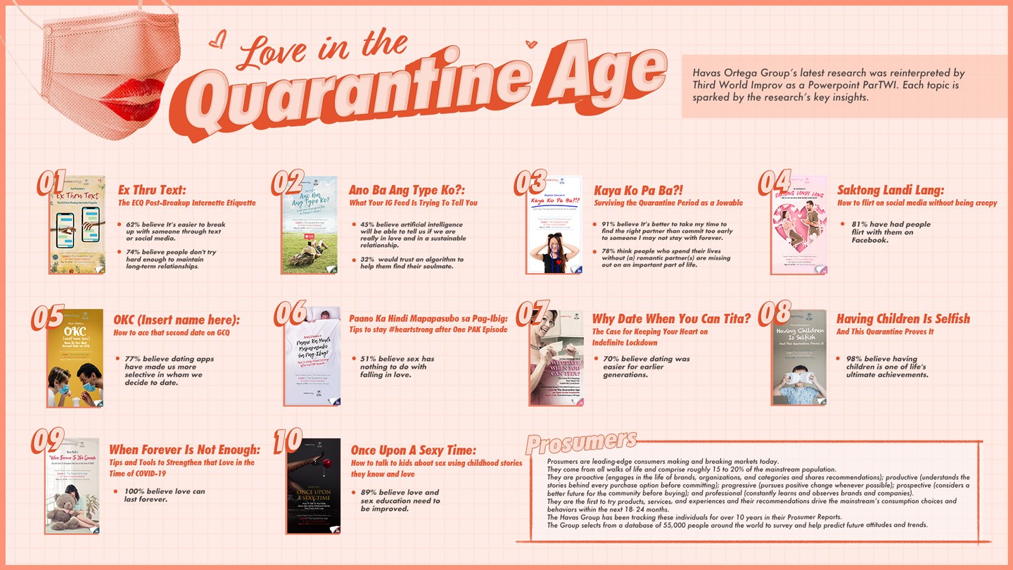 “Even the most romantic Filipinos are in limbo and are asking what the new dating rules are, what a loving relationship feels like, and what commitment means when you’re not even allowed to see or hold your partner. We have studied love in the digital age globally and locally. But what does this same love look like in the quarantine age?”